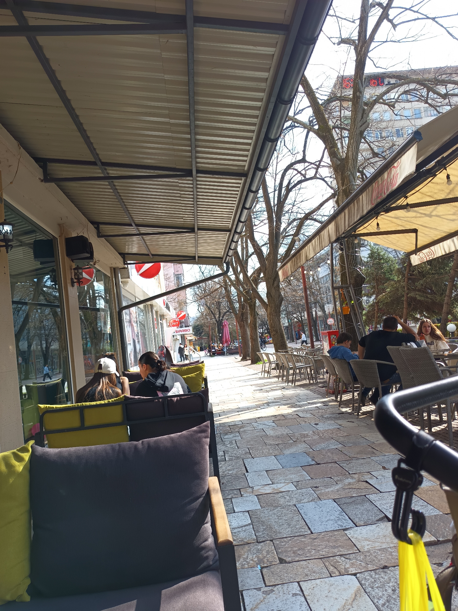 The image depicts an outdoor cafe scene in Targovishte, Bulgaria. Two women are seated on an olive green and gray sofa under a metal awning attached to a building on the left. Beyond them, the pedestr…read more