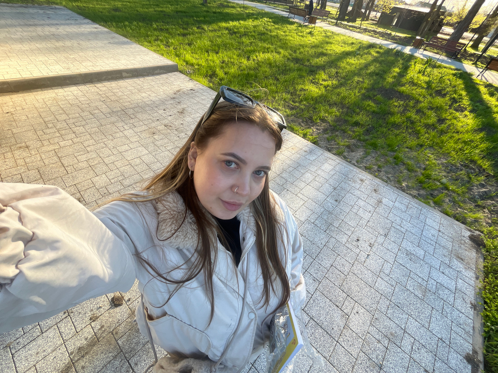 A young woman with long brown hair and blue eyes is the central figure in an upside-down outdoor selfie. She wears a light-colored jacket with a fur-lined collar. Sunglasses rest on her hair. She is s…read more