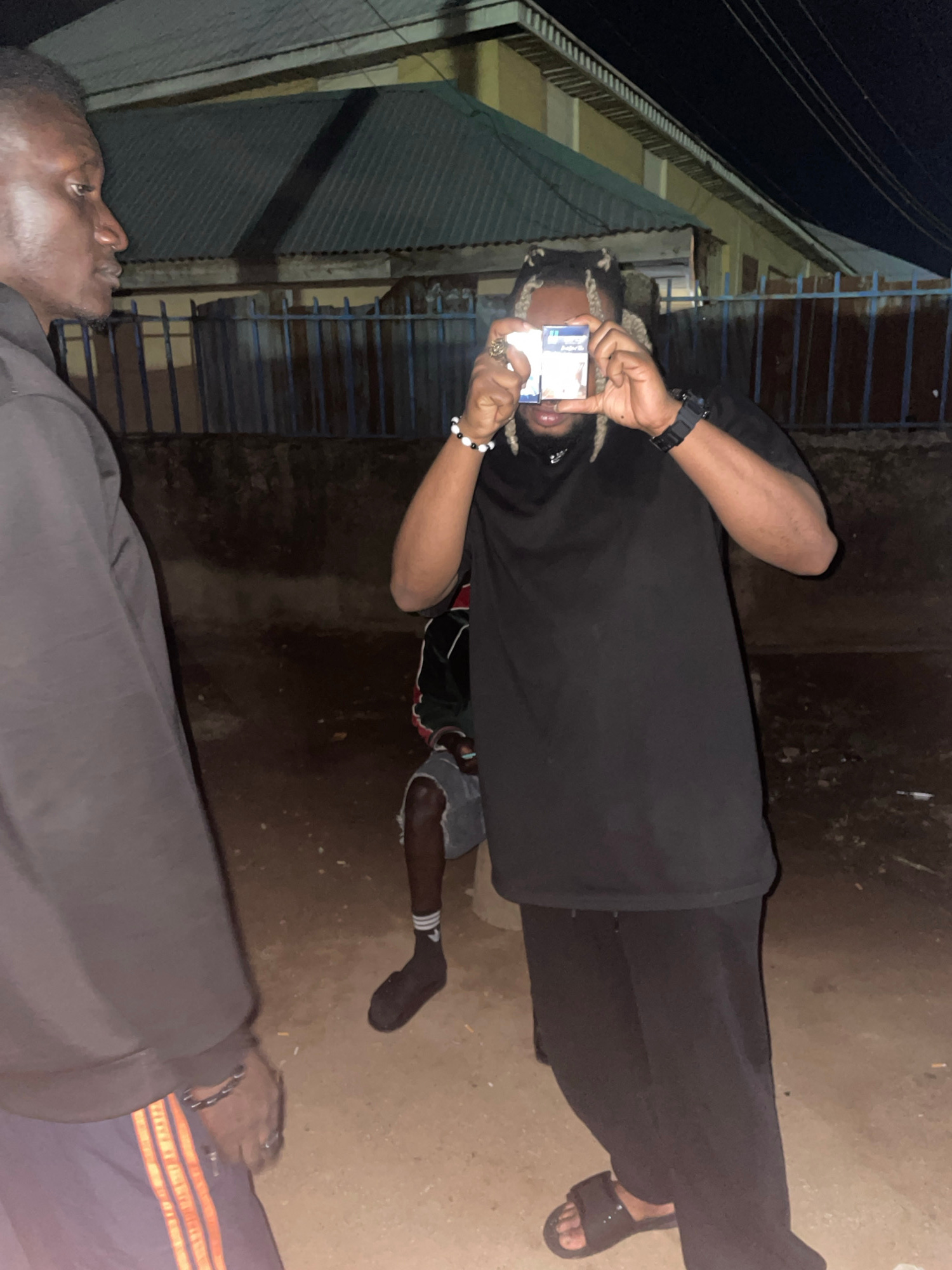 The image, taken at night in what appears to be an outdoor residential or street setting in Jos, Nigeria, shows three individuals in low light conditions. The primary subject, positioned centrally, is…read more