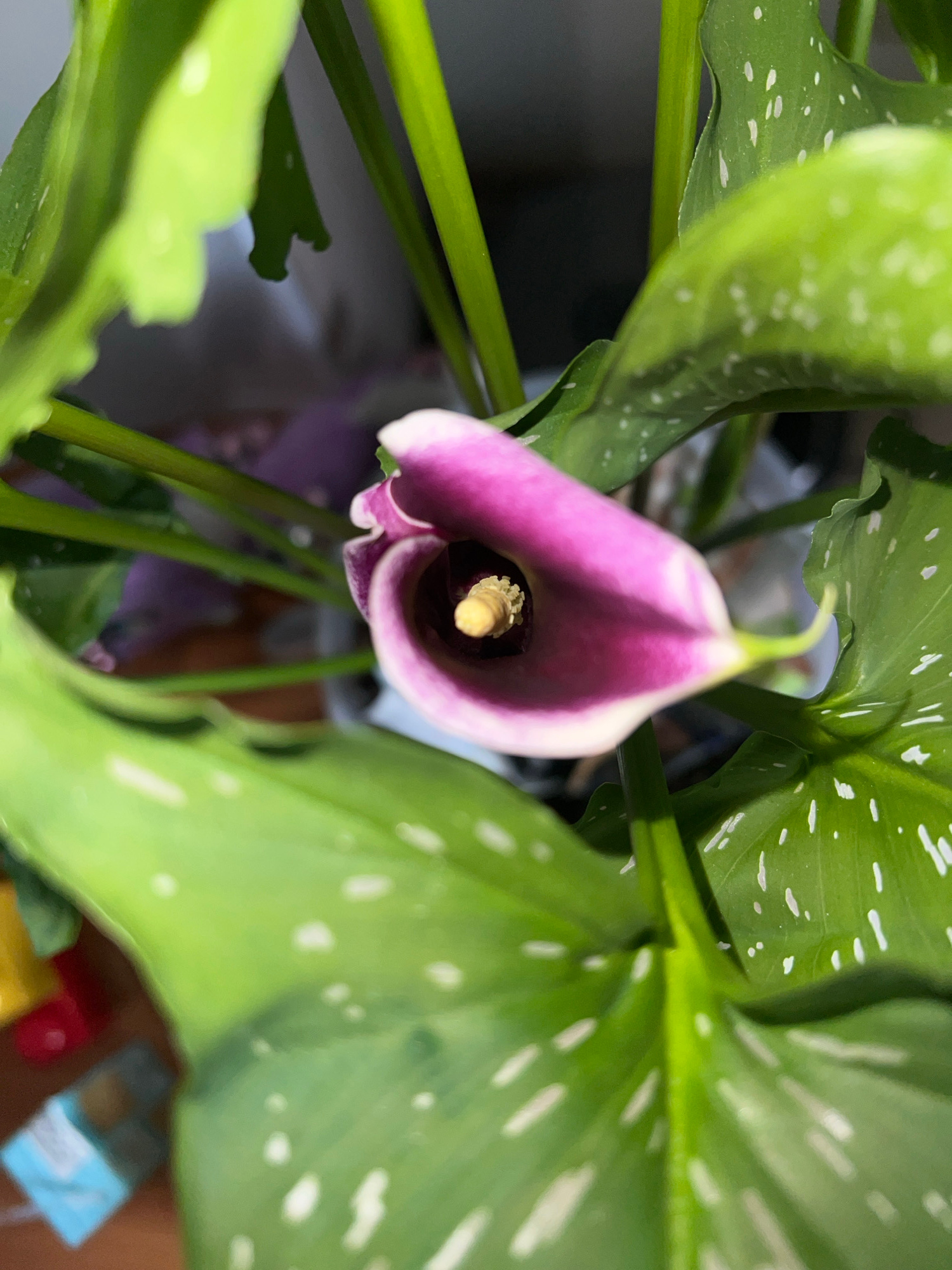 The image shows a close-up of a potted plant with a purple calla lily flower in bloom. The flower has a pale edge and a yellow stamen. The plant has green leaves with white spots. The background is ou…read more