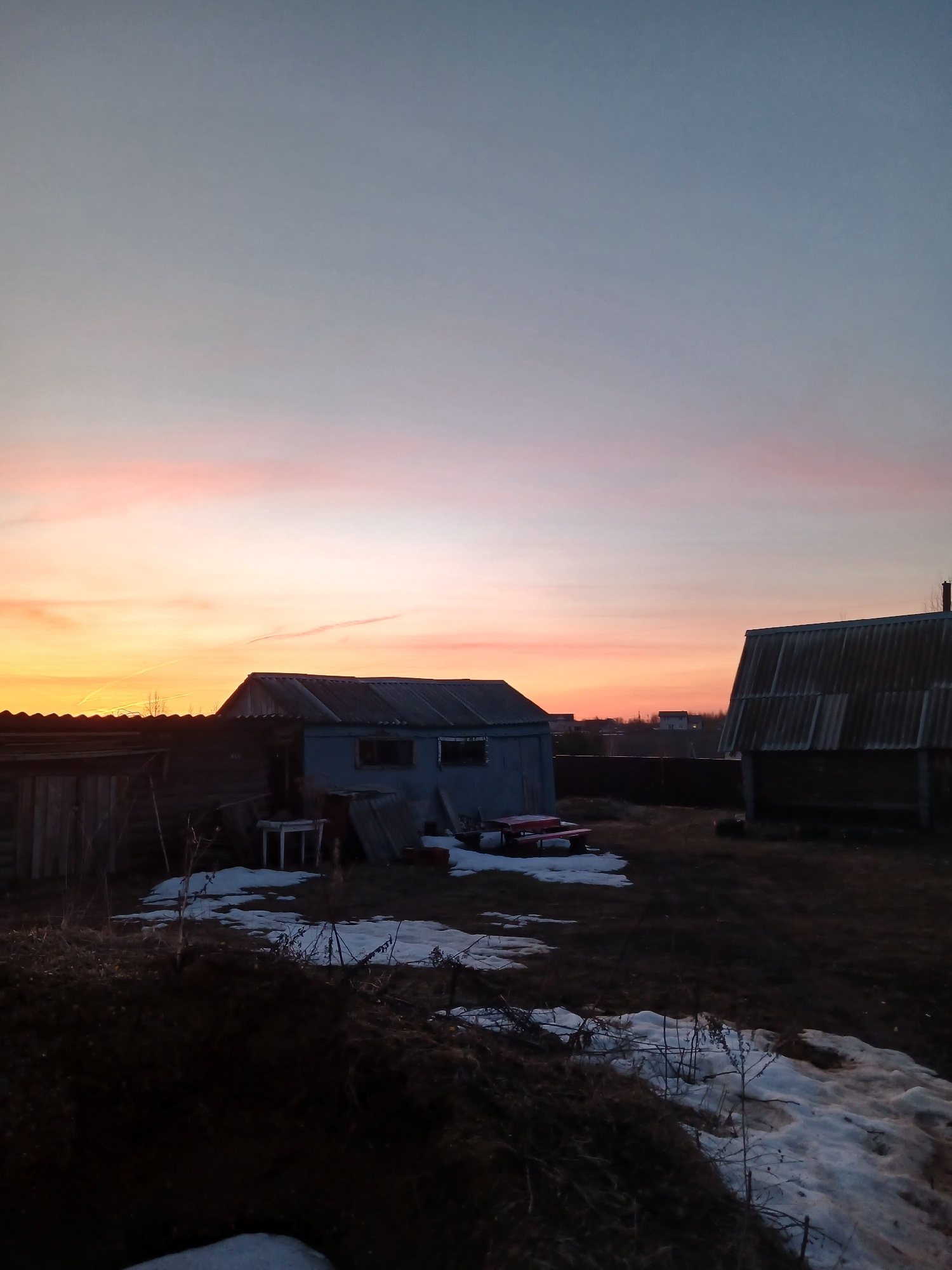 This landscape photograph captures a tranquil rural scene in Bolshaya Sosnova, Russia, likely during either sunset or sunrise. The image is composed with a wide expanse of sky dominating the upper por…read more