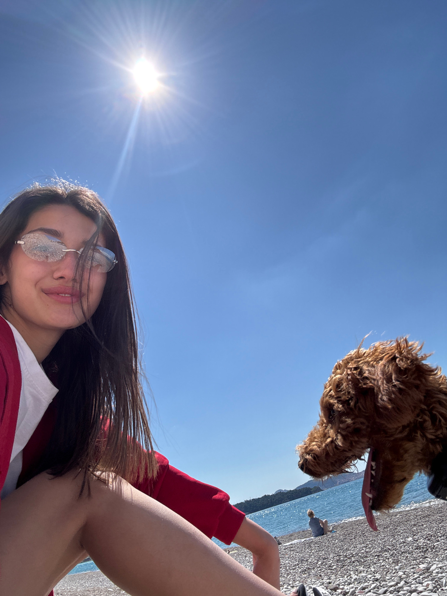 A selfie photograph taken outdoors on a beach in Sutomore, Montenegro. The subject is a young woman wearing sunglasses and a red and white shirt. She is holding the camera, capturing herself along wit…read more