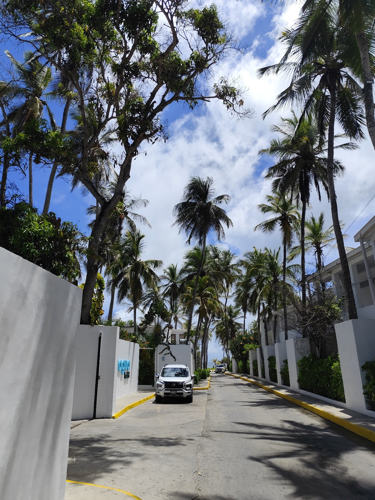 The image shows a street in Playa El Agua, Venezuela. The road is paved and has a yellow curb on both sides. White walls line either side of the street, with vegetation and palm trees visible above th…read more
