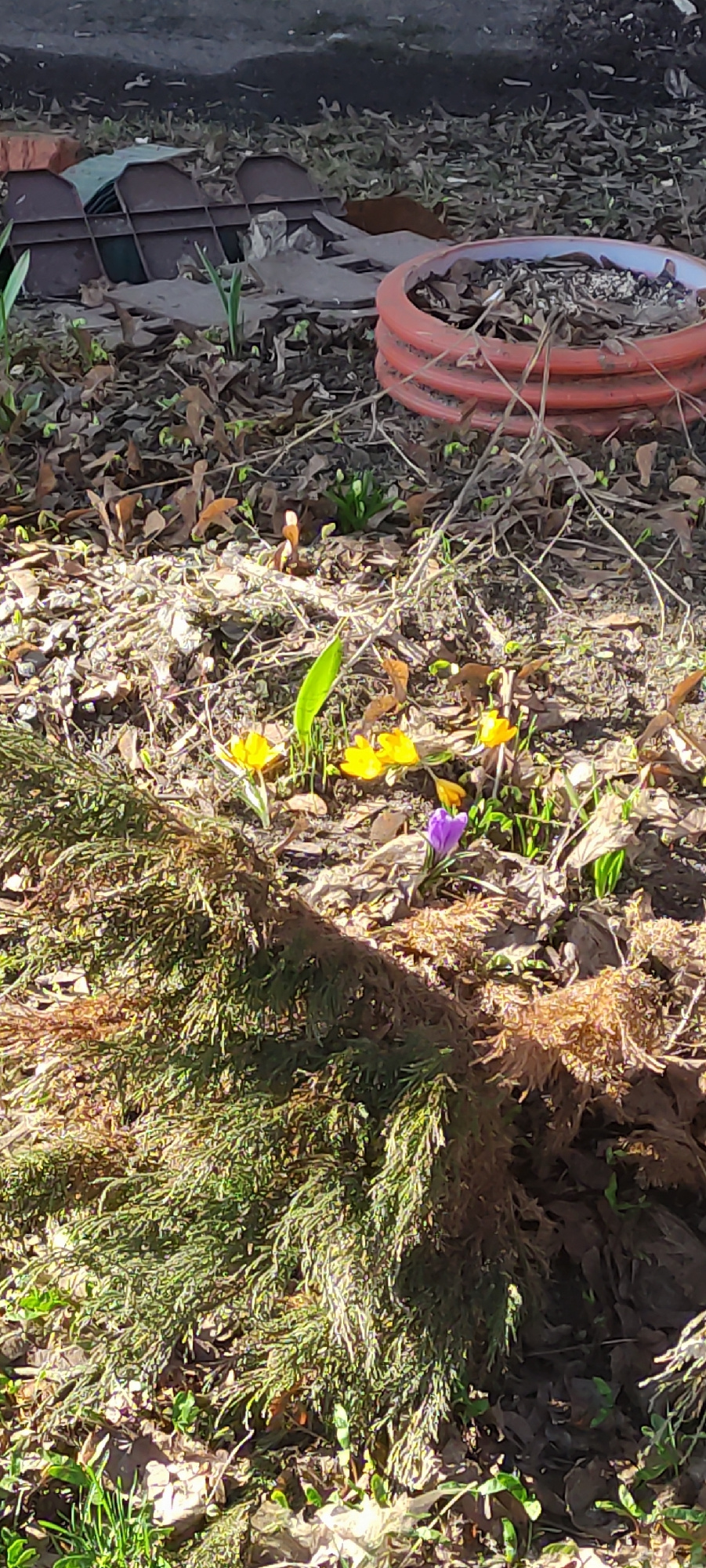 The image depicts a close-up view of a garden bed, possibly in Fryazino, Russia, though there is no explicit evidence to confirm this. Visible within the garden bed are several yellow and one purple c…read more
