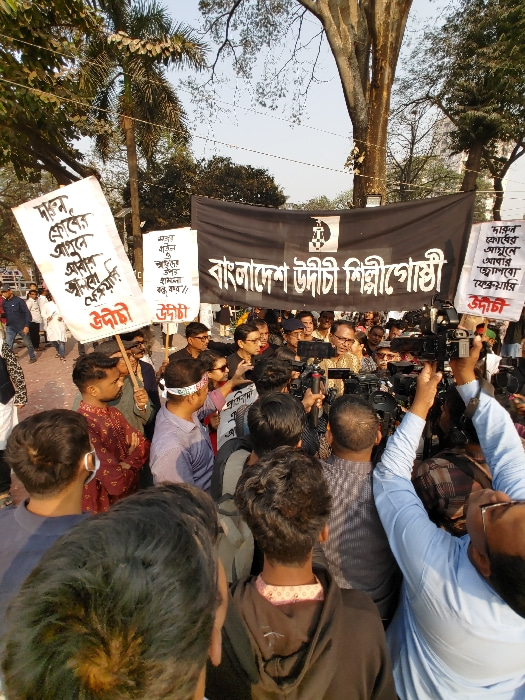 A public gathering is captured from above, revealing a crowd holding banners. One large black banner reads "Bangladesh Udichi Shilpigoshthi" along with a stylized portrait. Several smaller handwritten…read more