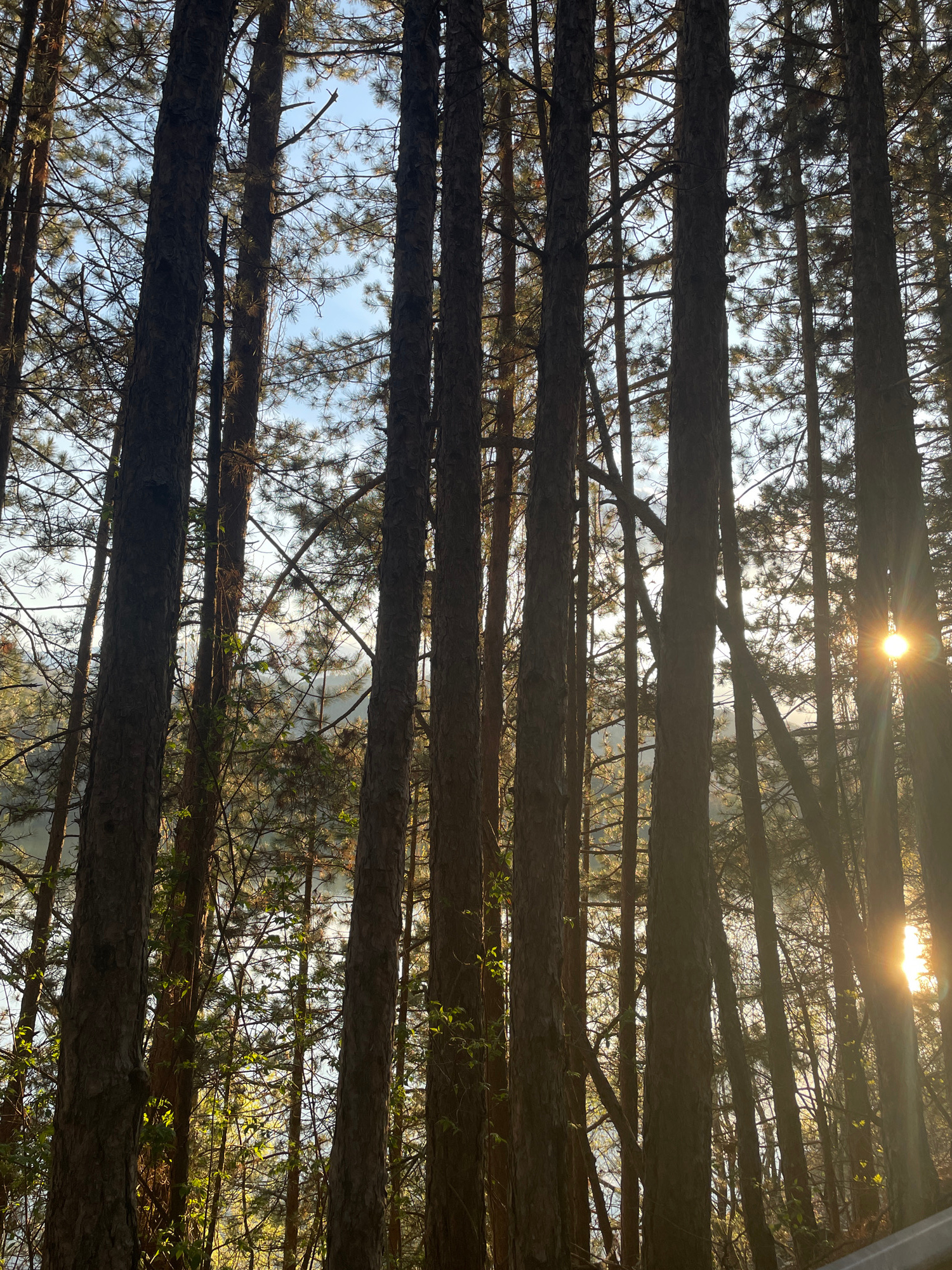 The image depicts a view looking up through a dense pine forest, presumably in Pancharevo, Bulgaria. The trunks of the trees are visible, running horizontally across the frame. The sun is positioned i…read more