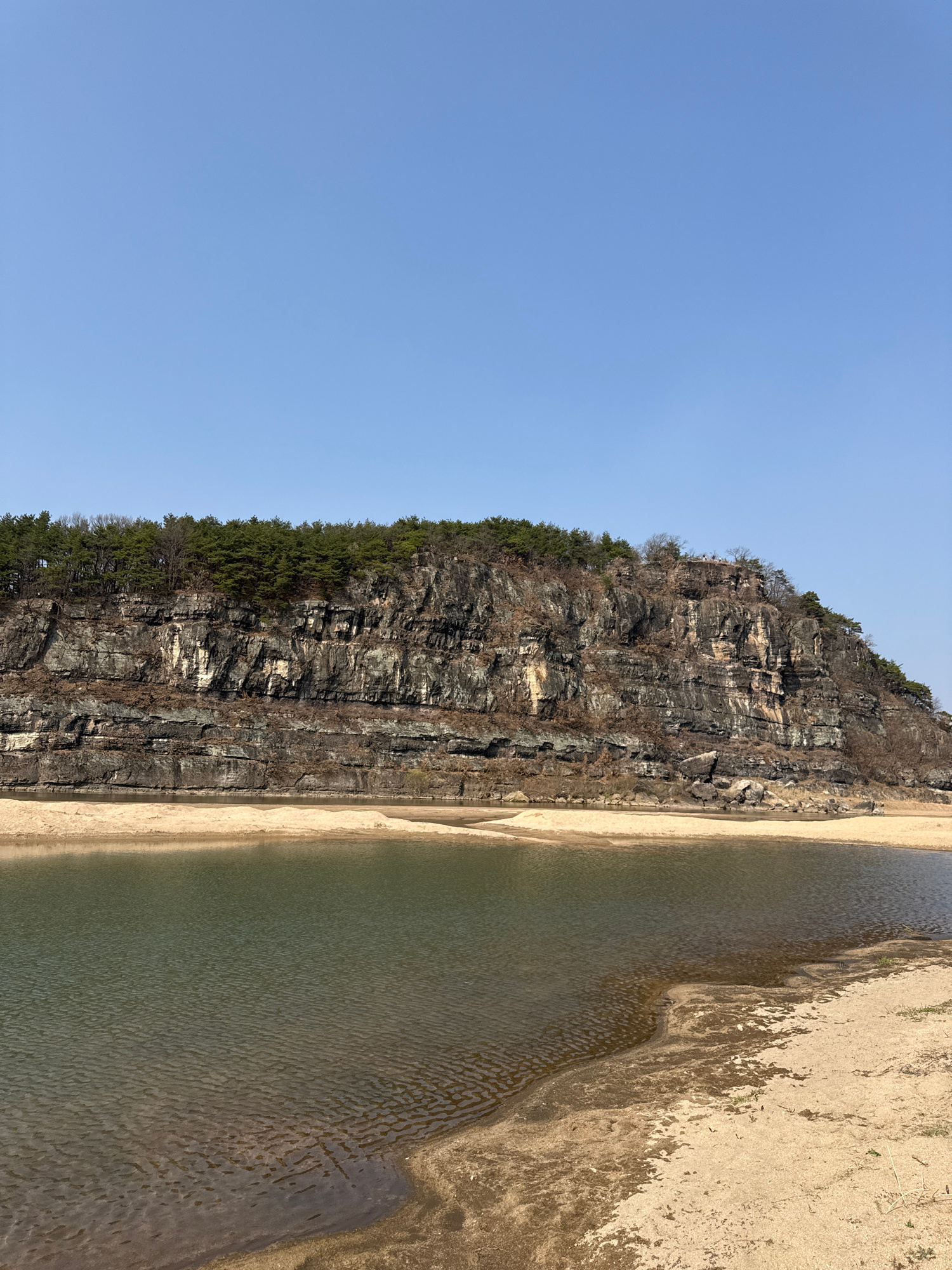 The image depicts a natural landscape scene at Buyongdae Cliff, overlooking the Nakdong River in Andong-si, Gyeongsangbuk-do, South Korea. The upper third of the frame features a clear, pale blue sky,…read more