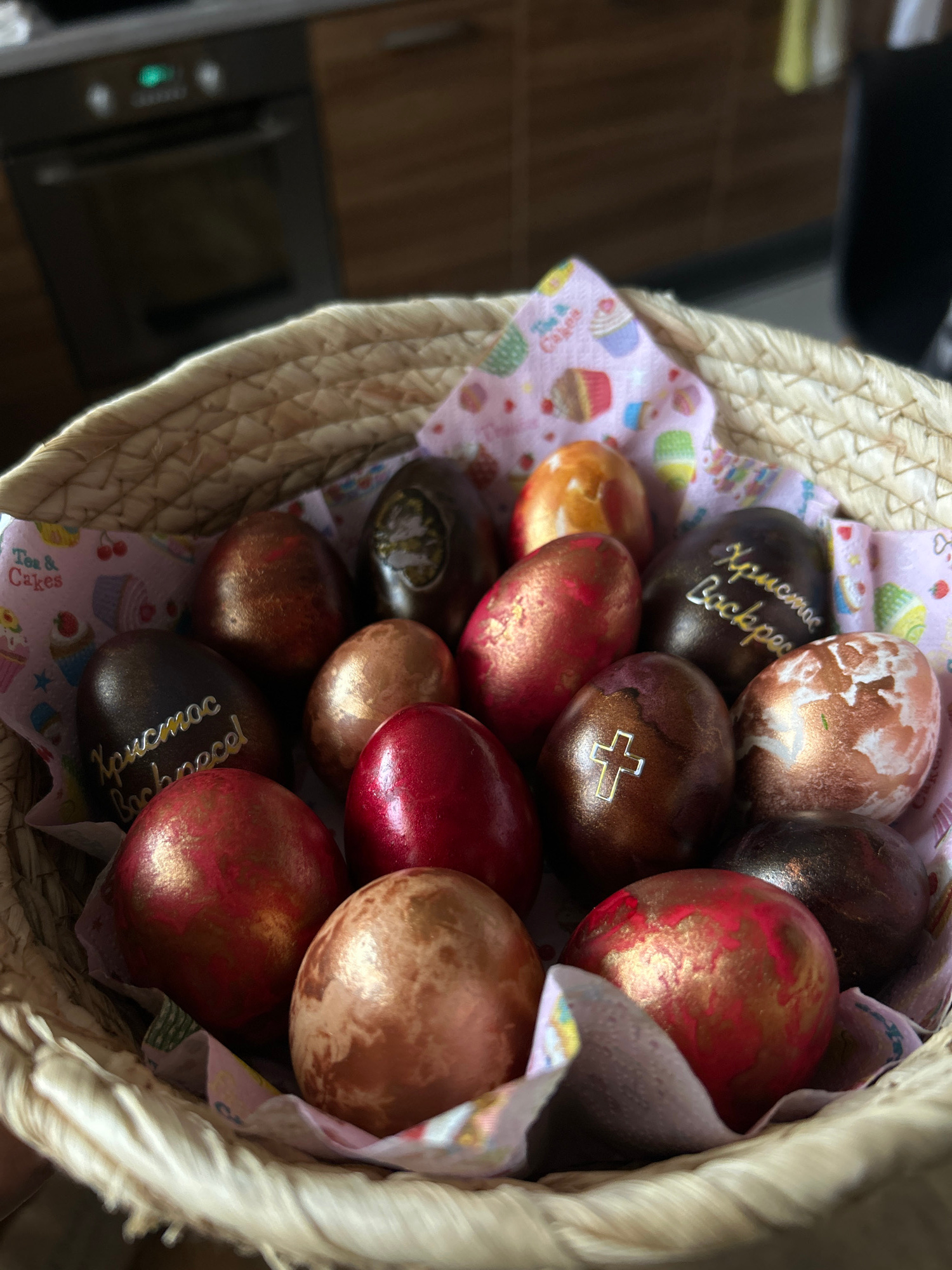 A close-up, high-angle shot shows a woven basket filled with Easter eggs resting on a pink cloth with images of cupcakes. The eggs are colored in shades of brown, gold, and red, some with shimmering g…read more