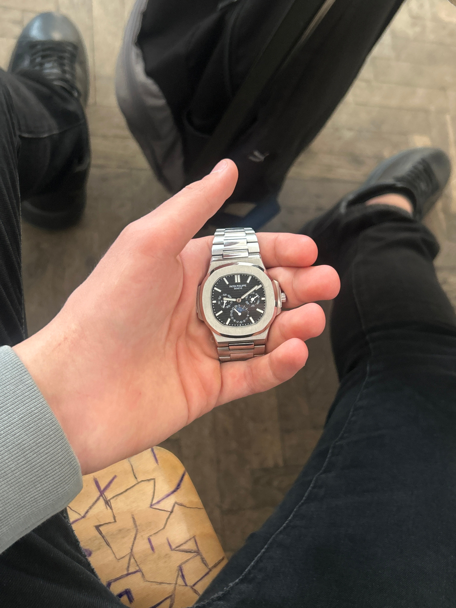 The image provides a close-up, top-down view of a person seated indoors in Zlatograd, Bulgaria. The central focus is the person's right hand, holding a high-end stainless steel Patek Philippe Nautilus…read more