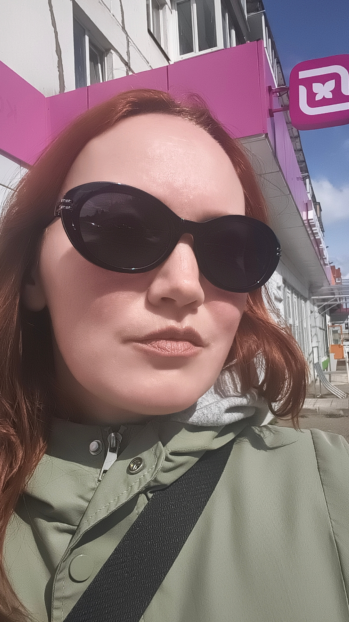 A close-up outdoor selfie depicts a person, likely female, with reddish-brown hair, wearing large black sunglasses. Her face, partially obscured by the sunglasses, shows a neutral expression with ligh…read more