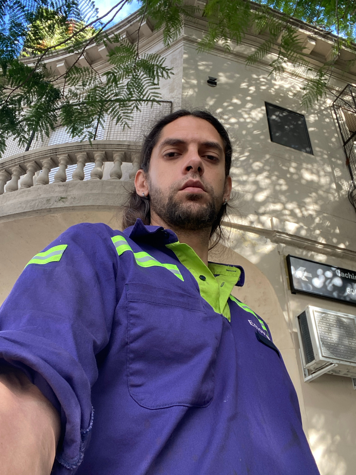 The image is a selfie taken by a man from a low, upward-looking angle, giving a unique perspective on an urban setting. The main subject is a man with long dark hair, a dark beard, and mustache, look…read more