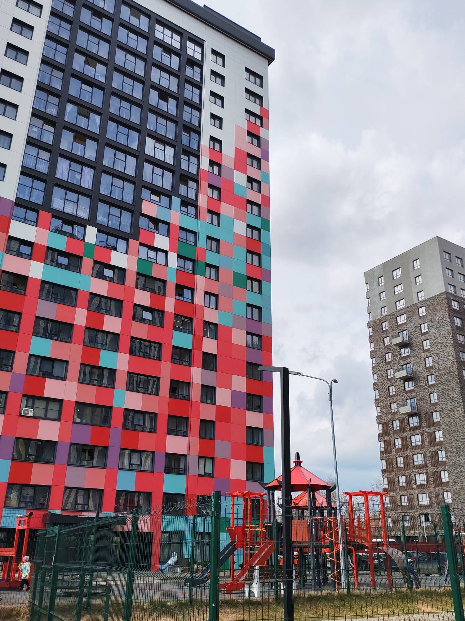 The photograph captures a scene outside a tall apartment building in Izhevsk, Russia. The building's facade is characterized by a vibrant, colorful pattern of red, pink, turquoise, and purple squares.…read more