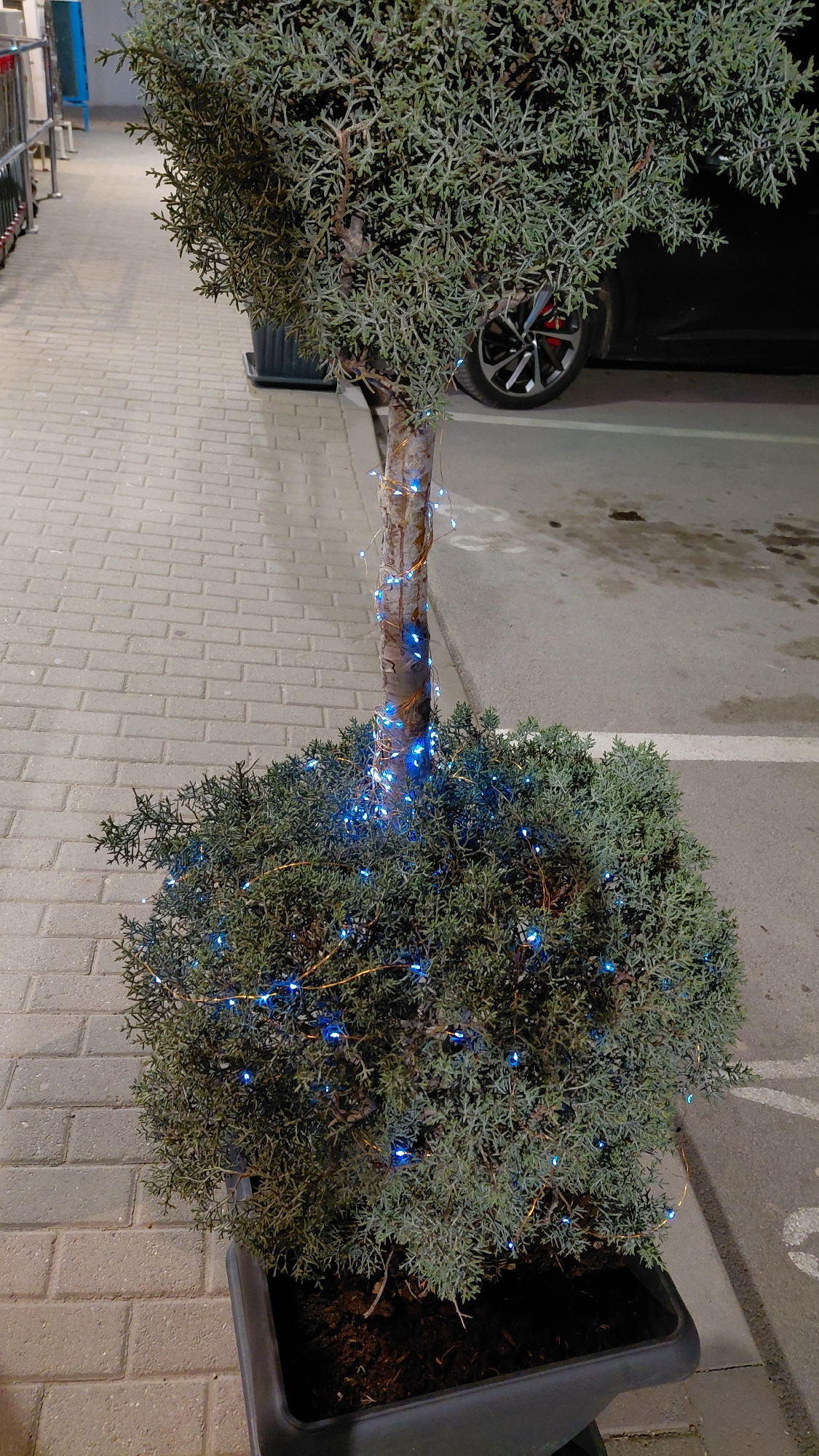 The image shows two potted trees with blue lights wrapped around their trunks, standing on a paved surface. The trees appear to be located in an urban setting, likely a parking lot or sidewalk near a…read more
