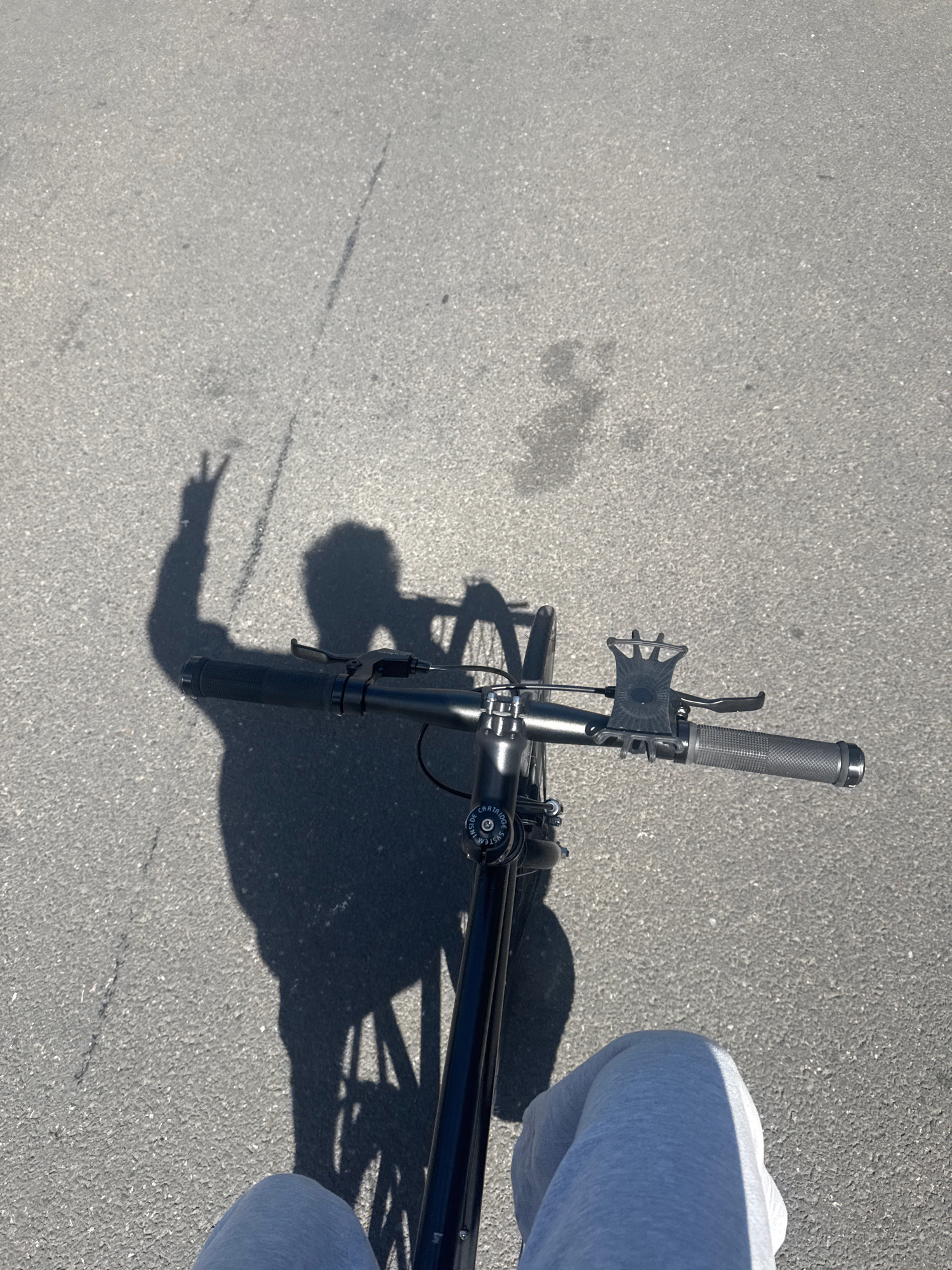 The image shows the handlebars of a scooter on asphalt. A phone holder is mounted on the handlebars. A portion of someone's sweatpants-covered leg is visible in the upper right. The image was likely t…read more