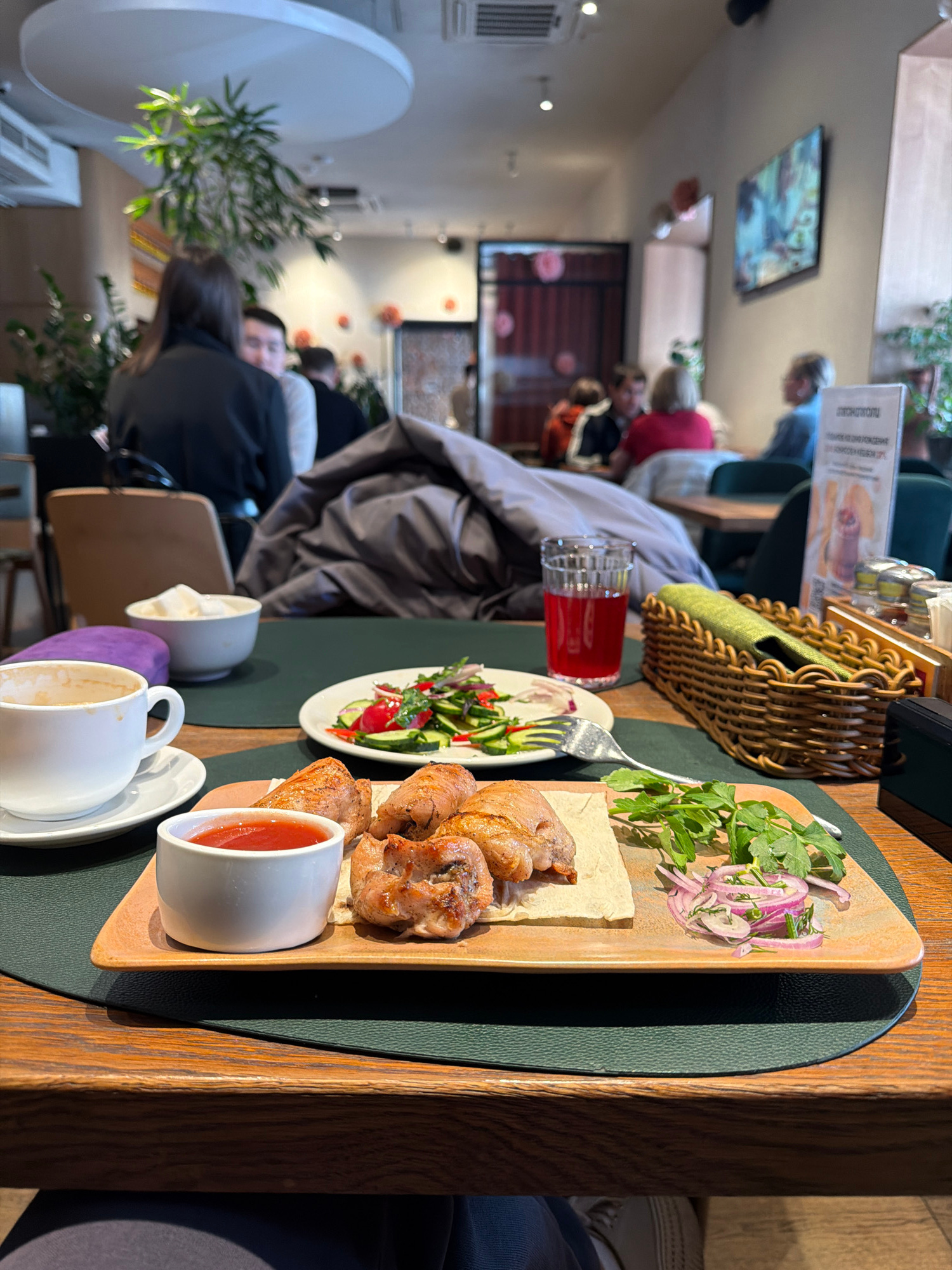 The image shows a table at a restaurant in Moscow, Russia. On the table is a wooden serving board with grilled meat, flatbread, red onion salad, herbs, tomato sauce, a small salad with tomatoes and cu…read more