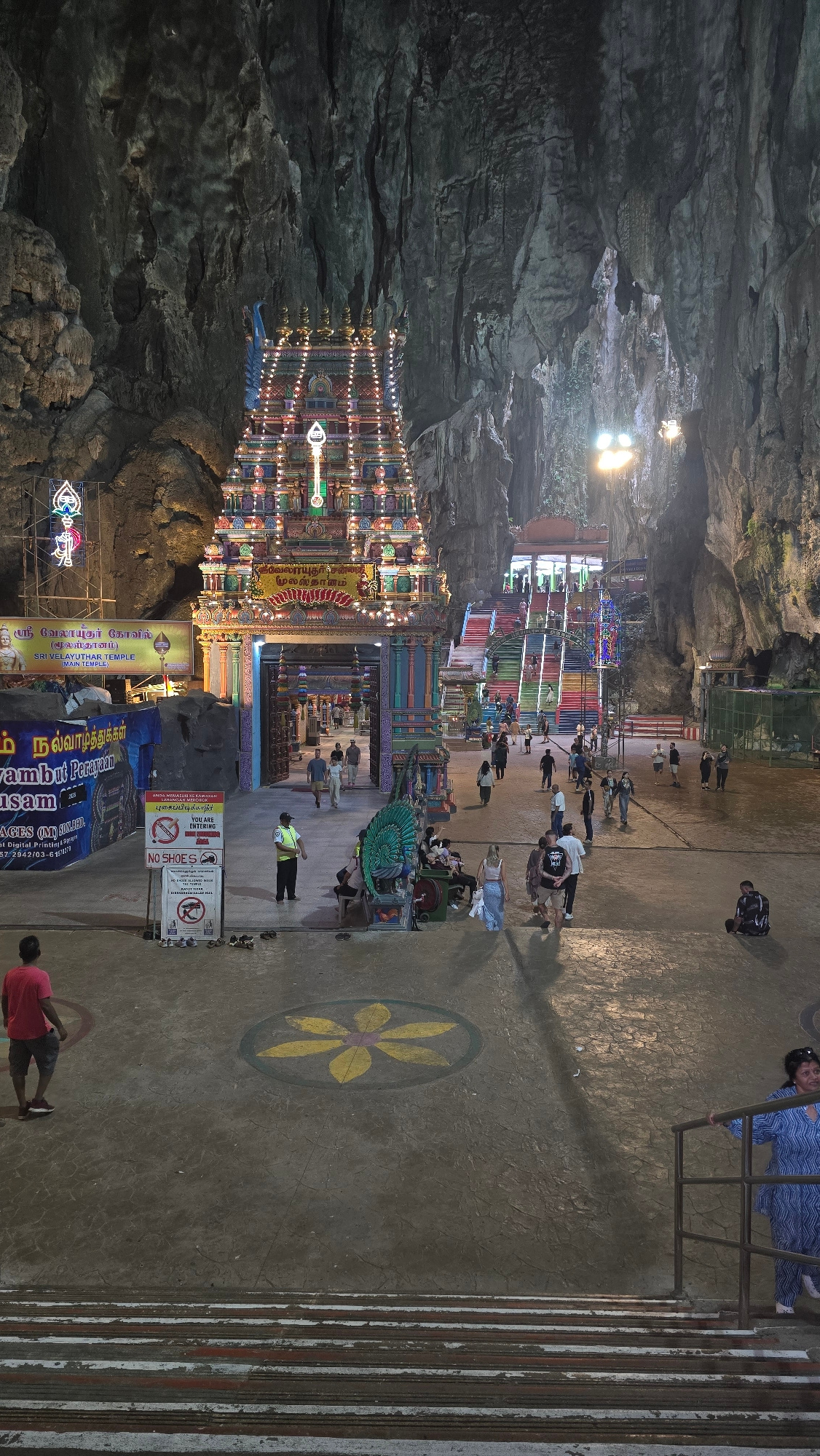 The image depicts the Batu Caves, a Hindu shrine located within a limestone hill in Gombak, Selayang Municipal Council, Malaysia. The main focus is on the brightly colored temple structures within the…read more