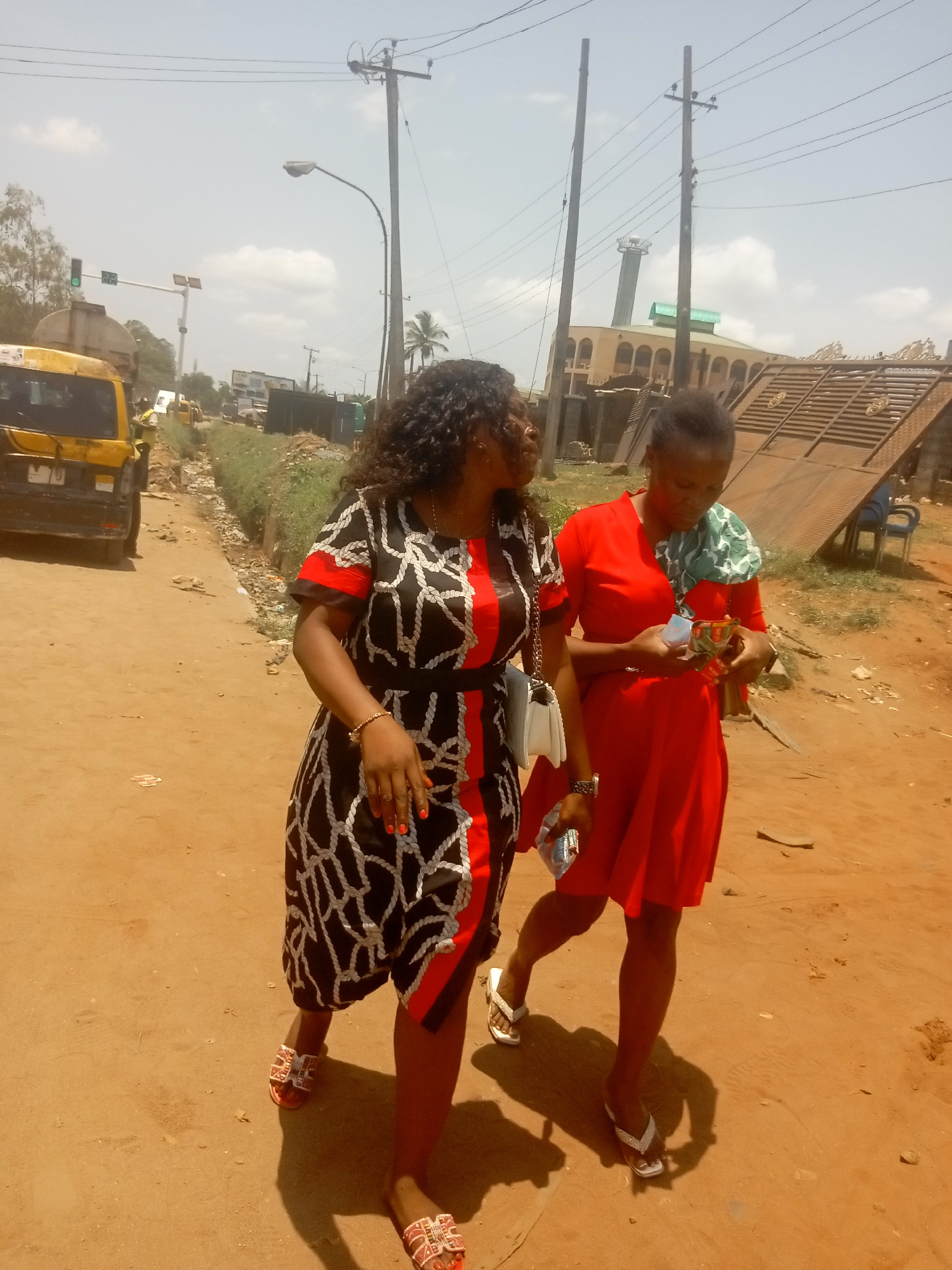 Two women walk along a sunny, unpaved dirt road in what appears to be an urban or semi-urban area, identified as Onitsha, Nigeria. The woman on the left has dark curly hair and wears a black dress ado…read more