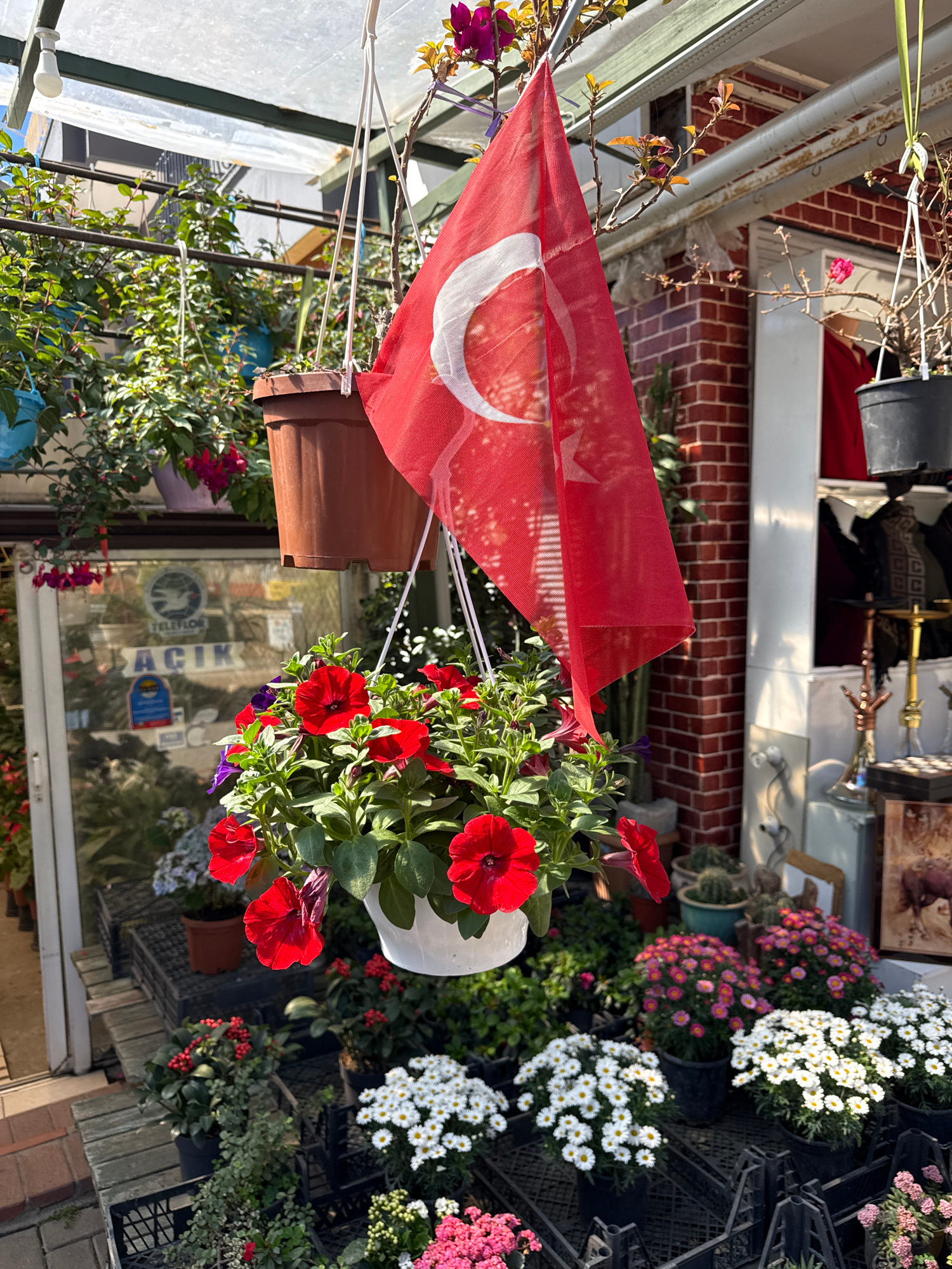 The image depicts an outdoor storefront in Alanya, Turkey, adorned with plants and Turkish flags. The dominant feature is a Turkish flag hanging at an angle in front of the storefront, with a white cr…read more