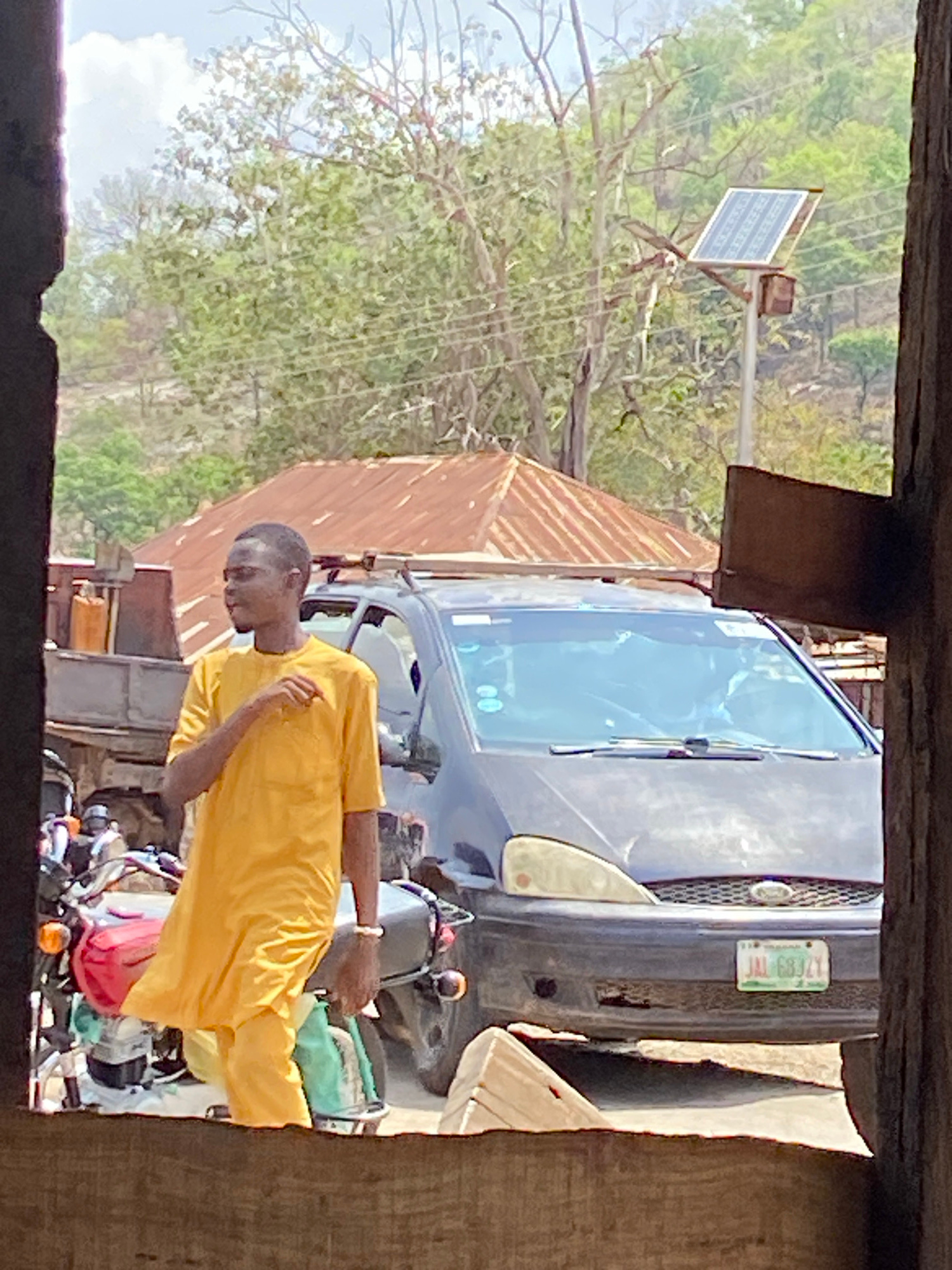 The image, apparently taken from a sheltered or enclosed space, presents a street scene in Mararaba, Nigeria. A man wearing a bright yellow shirt and matching pants is visible. The man stands next to…read more