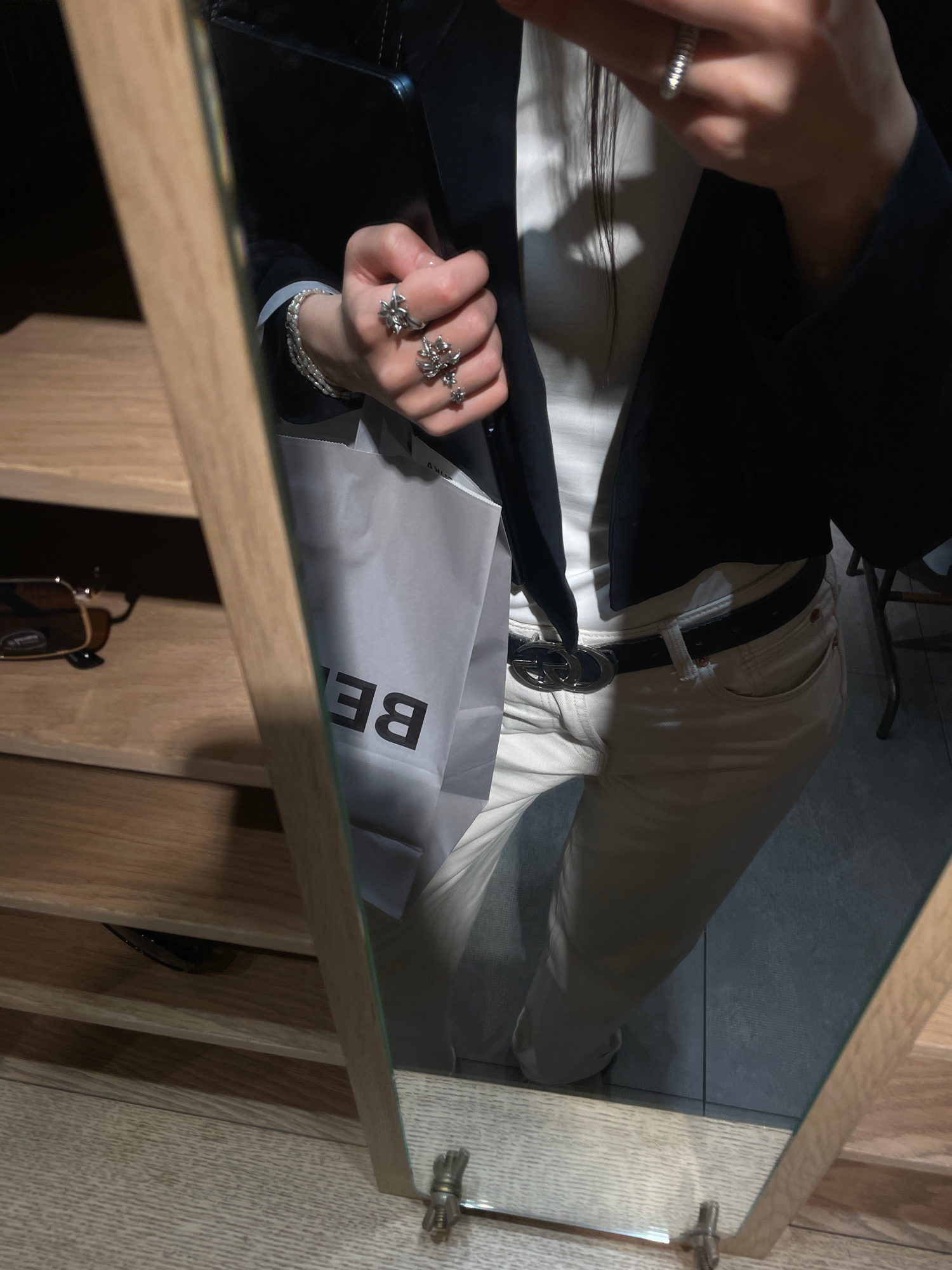 The image shows a mirror reflection of a person wearing white jeans with a black belt and black buckle. The person is also wearing a black blazer. The reflection shows the person holding a black object or device and a white bag with the letters "BE" printed on it. The person's hands are visible, adorned with multiple rings and a pearl bracelet. The image is taken from an interior setting, possibly a retail store in Yerevan, Armenia. This assumption is based on the presence of the shopping bag, the mirrored reflection suggesting a dressing room or display area, and the general style of the scene which aligns with modern retail environments. | Open Wire