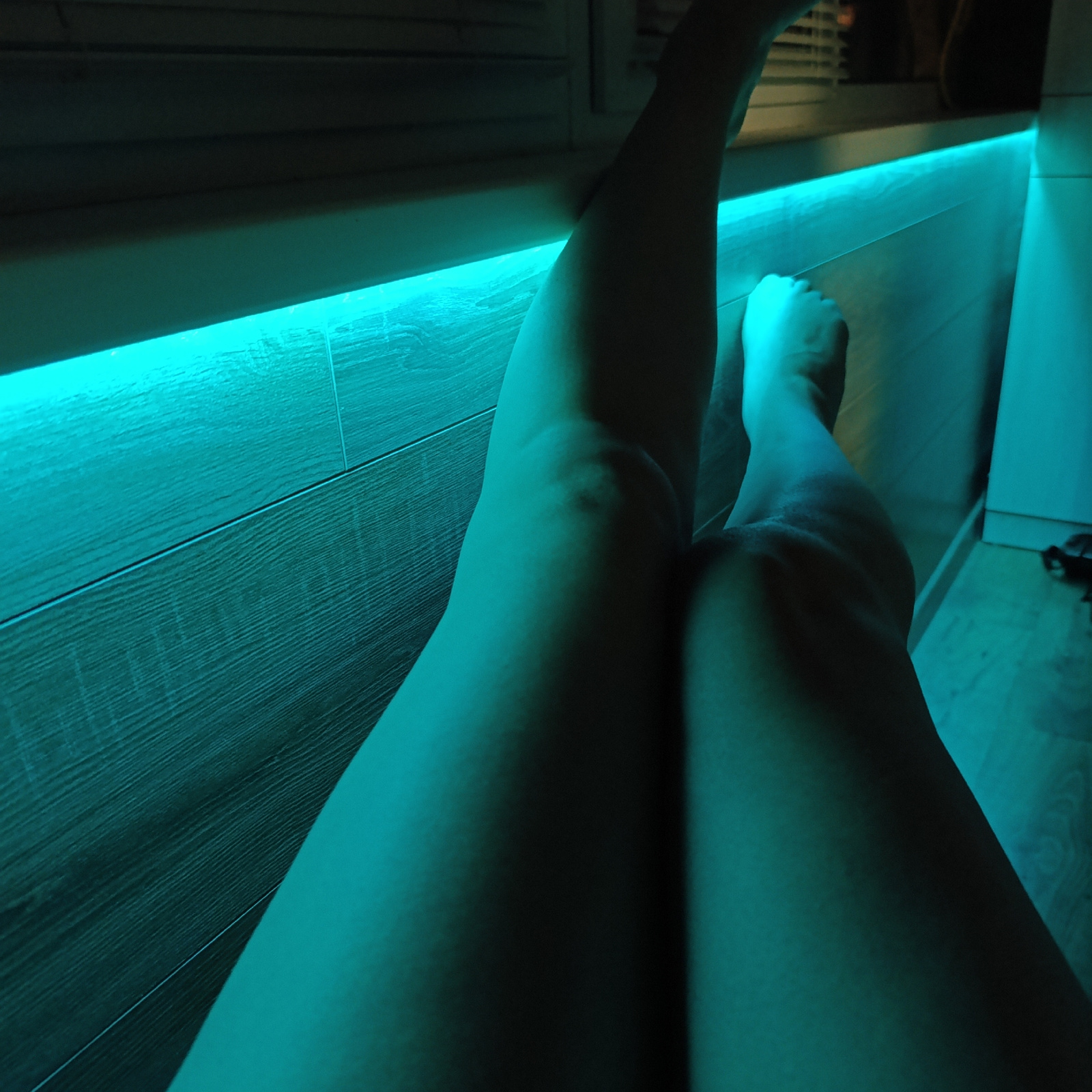 The image shows a pair of legs resting against a wall with blue LED lighting. The wall appears to be made of wood paneling. The feet are visible. The location in the city of Марковский, Russia is not…read more