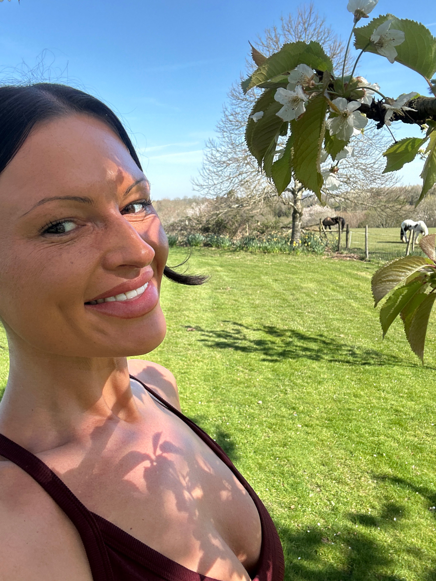 A woman is lying in a grassy area in Tunbridge Wells, United Kingdom. The foreground contains a close-up of the woman's face and upper torso. She is smiling, with a strand of hair rising upwards from…read more