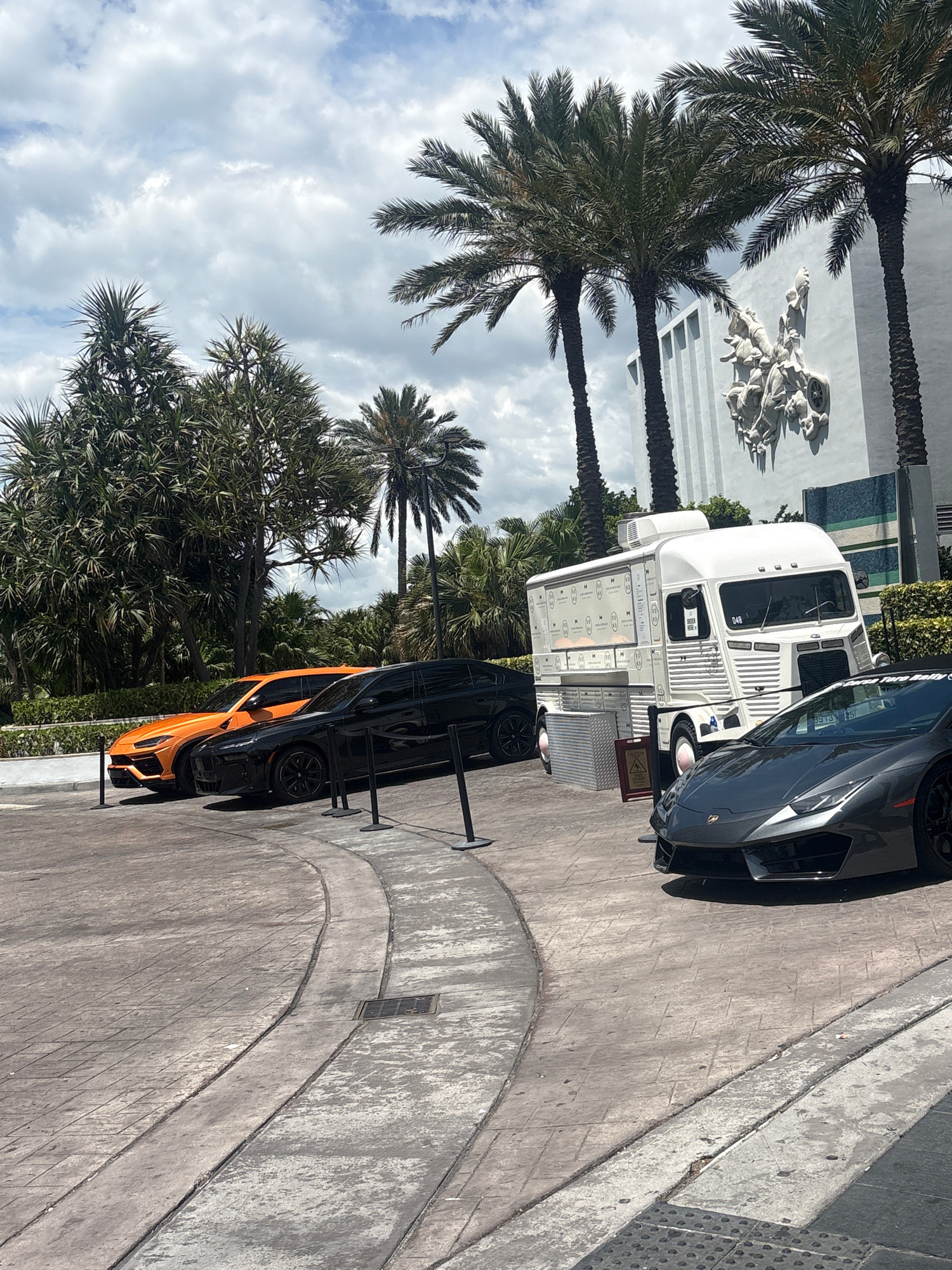 The image shows a street scene in Miami Beach, United States of America. In the foreground, there is a gray concrete pavement. An orange and black sports car is parked facing the camera. A white truck…read more