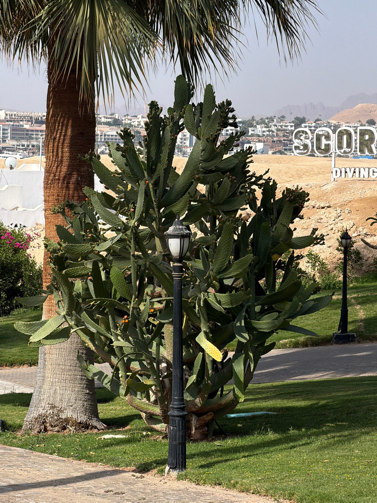 The image captures a vibrant, sun-drenched outdoor scene, likely within a resort or coastal area in Sharm El Sheikh, Egypt. The foreground and midground are dominated by lush vegetation typical of ari…read more