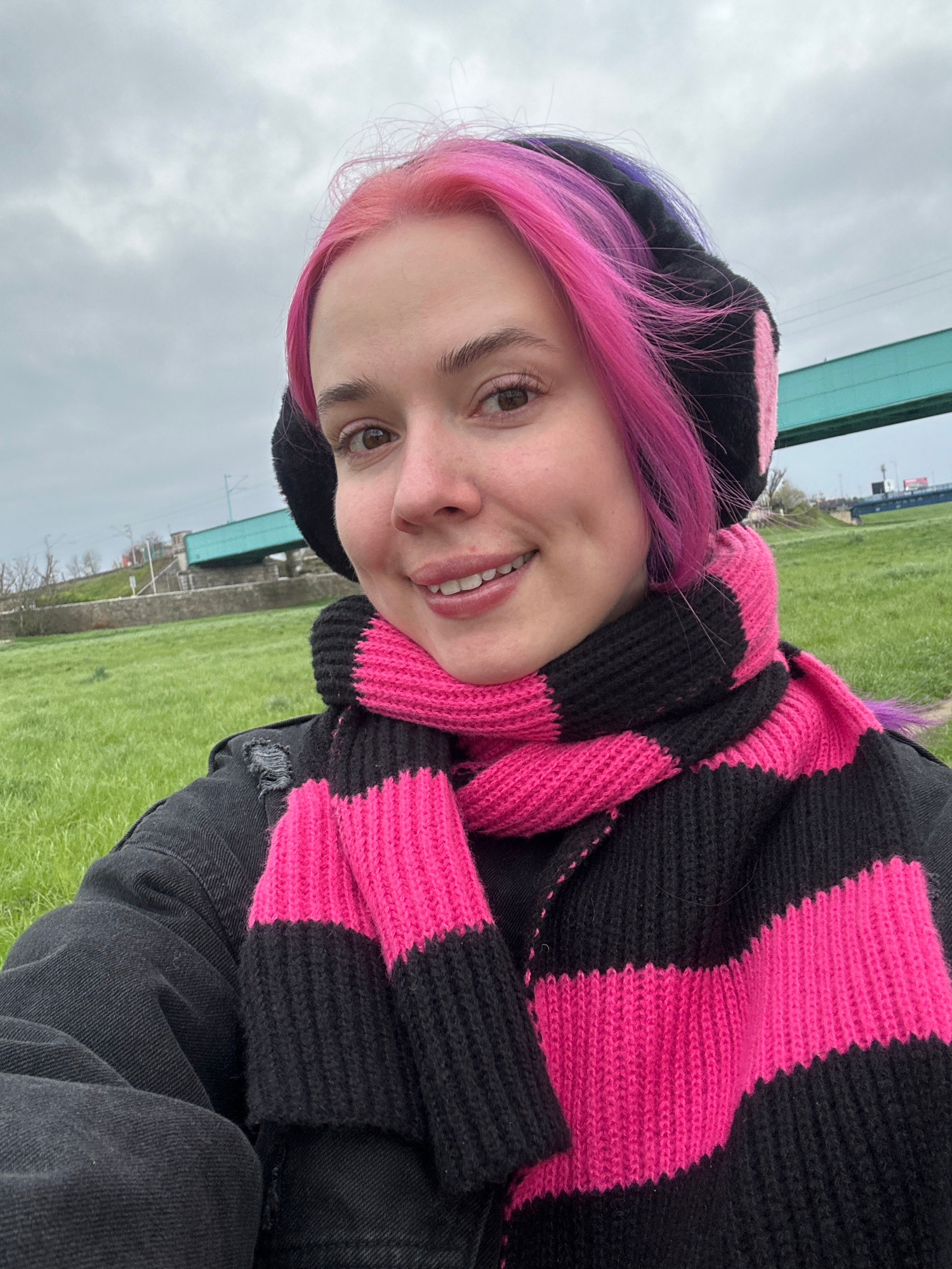 A young person with pink hair stands on a grassy area with buildings in the background. The person wears a black and pink striped scarf and a black hat with pink accents. They are smiling. The locatio…read more