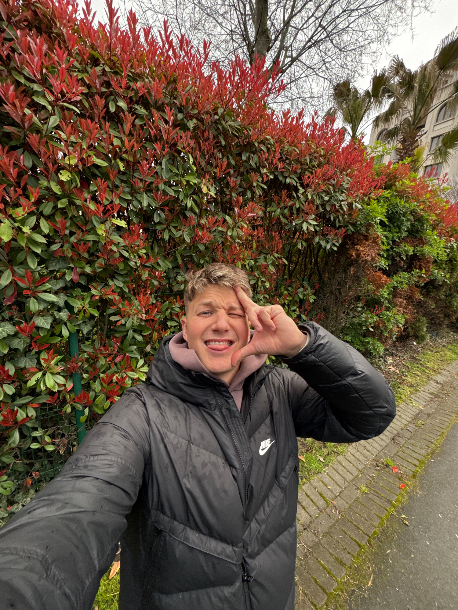 The image shows a young person taking a selfie outdoors next to a hedge with red and green leaves. The person is wearing a black puffer jacket with a Nike logo and is making a playful face and a "peac…read more
