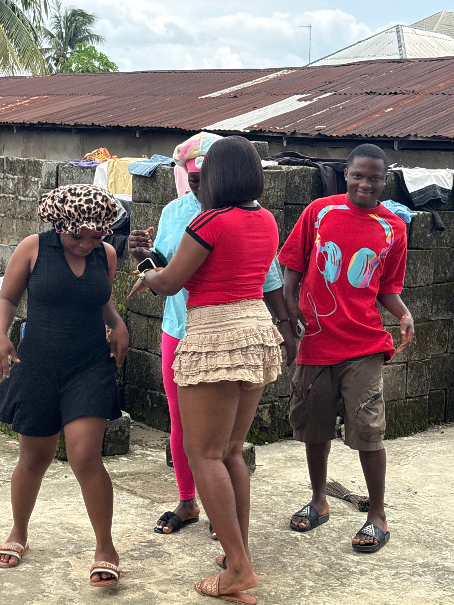 This daylight outdoor photograph, taken in Ikot Ekpene, Nigeria, features four individuals – one man and three women – standing on a textured concrete or stone ground. In the back-right, a man with s…read more