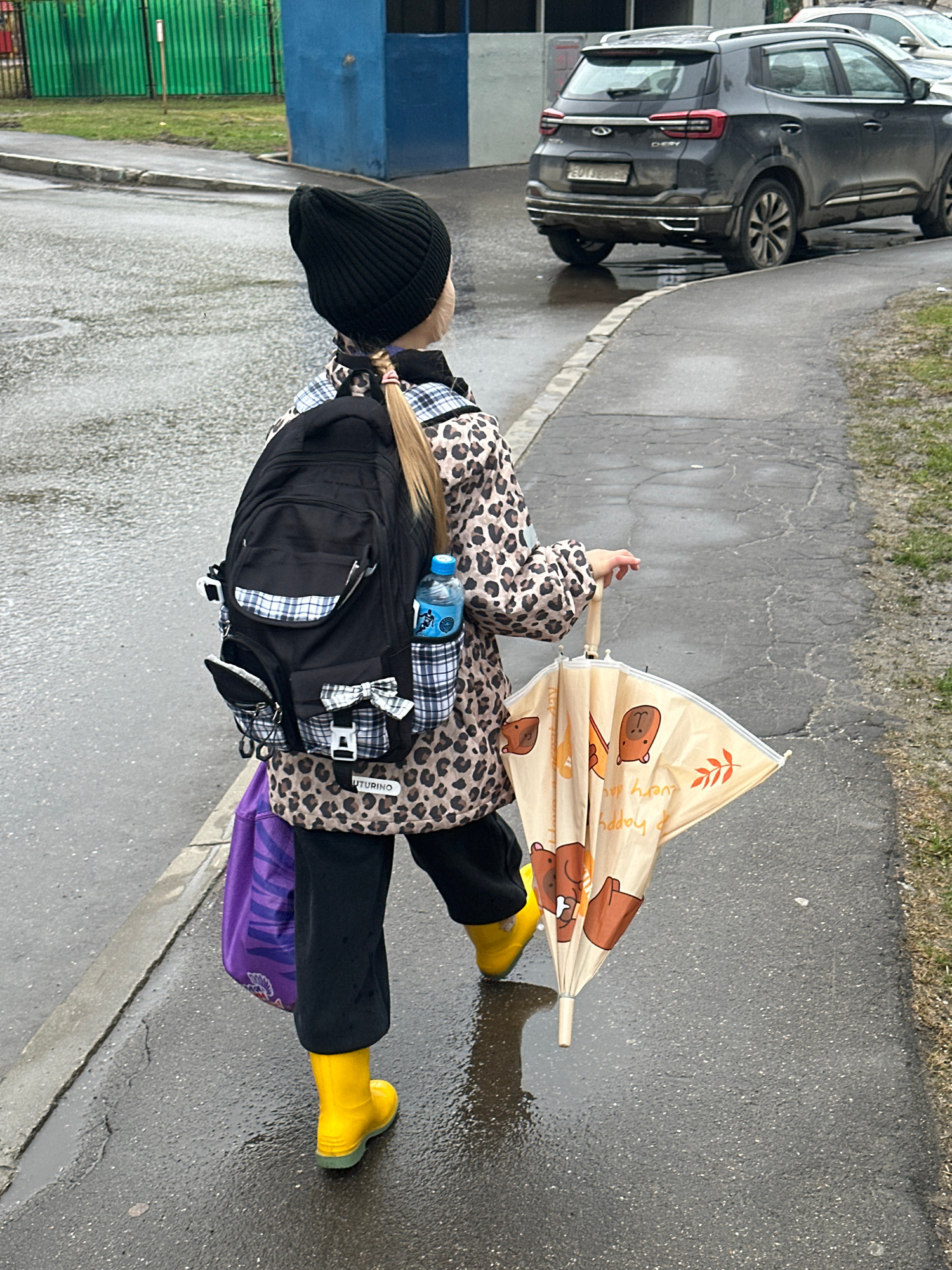 A girl is walking on a wet, urban sidewalk. She is wearing a black beanie, a leopard-print jacket, black pants, and bright yellow rain boots. She has a black backpack with a water bottle attached and…read more