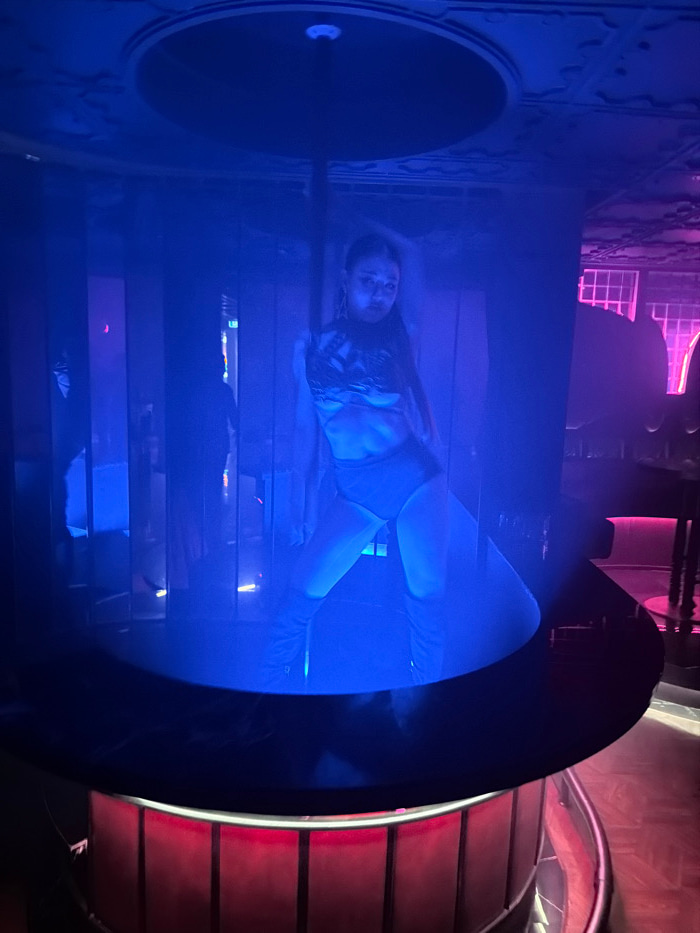 An indoor scene features a single female individual on a circular stage under predominantly blue and red artificial lighting. The subject, with dark hair, wears a dark, patterned crop top, dark briefs…read more
