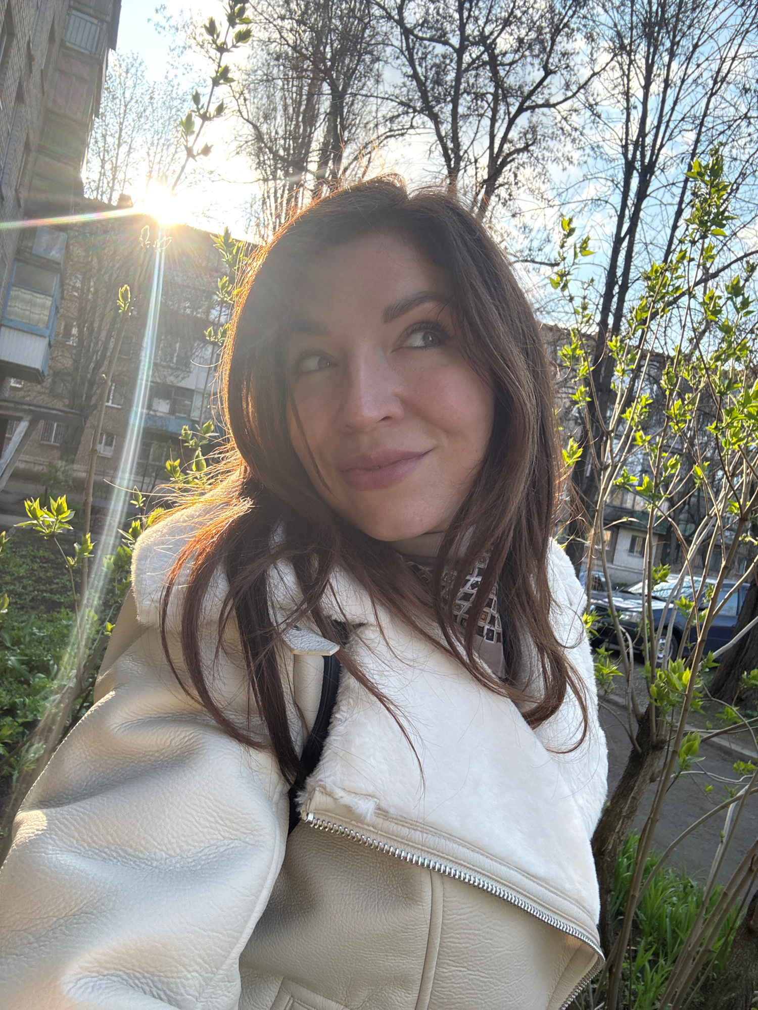 A medium shot captures a young woman outdoors in an urban setting. She is turned slightly to her right, facing the camera with a soft smile. She wears a light-colored jacket with a fluffy collar. The…read more