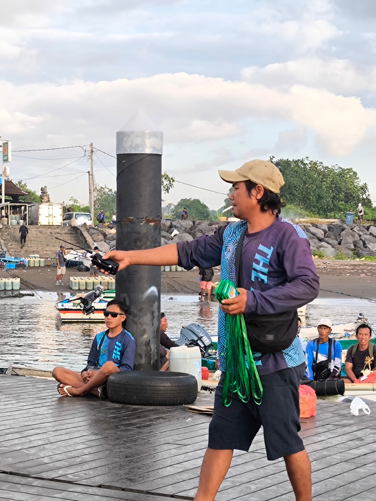 Captured in Denpasar, Indonesia, the image shows a man standing on a wooden dock. He wears a beige cap, a long-sleeved shirt with the word "THE" printed on it, dark shorts, and a black shoulder bag. I…read more
