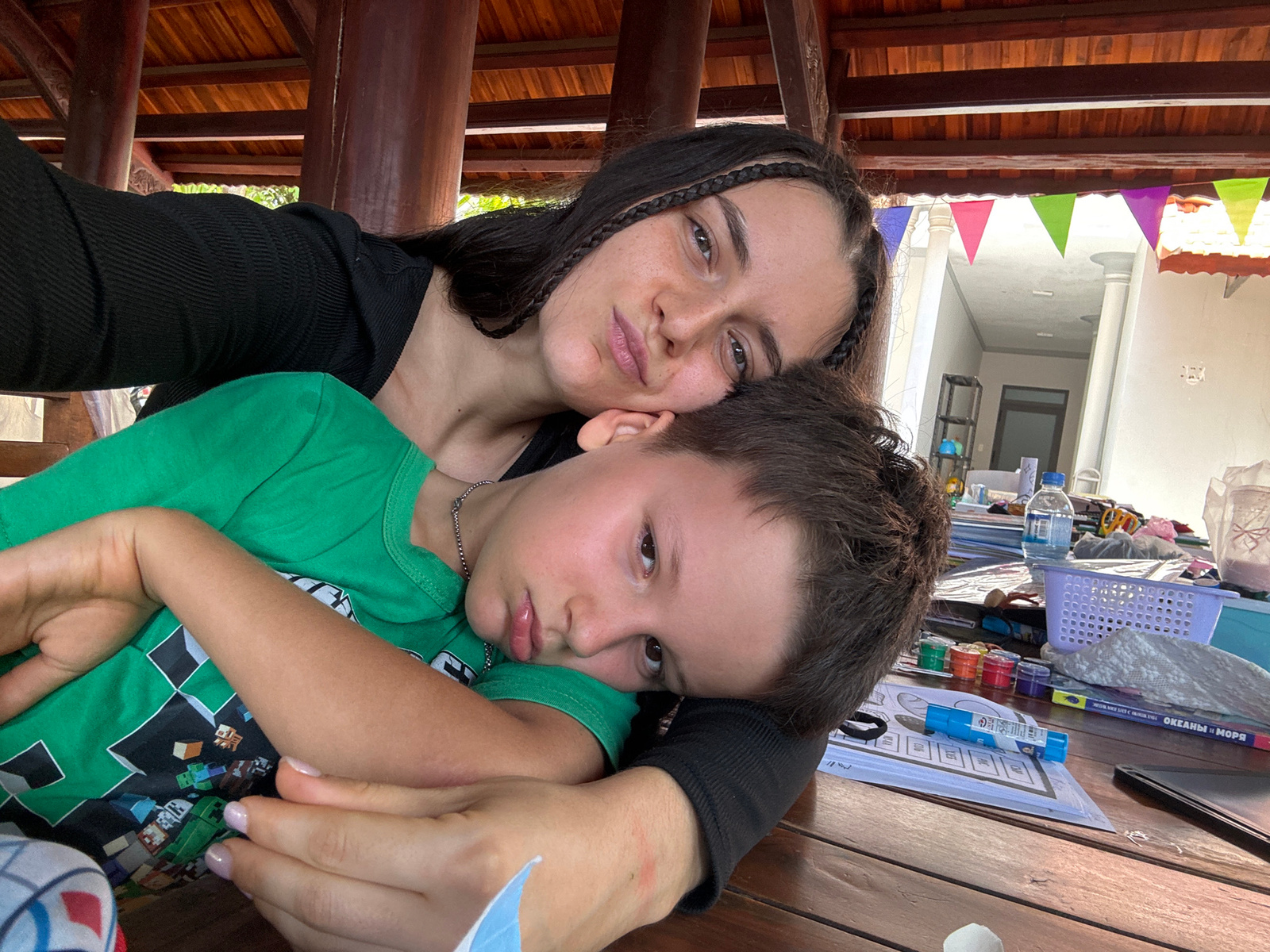 A closely framed portrait captures an adult woman embracing a young boy in what appears to be a covered outdoor space in Mũi Né, Vietnam. The image, originally taken in portrait orientation and rotate…read more