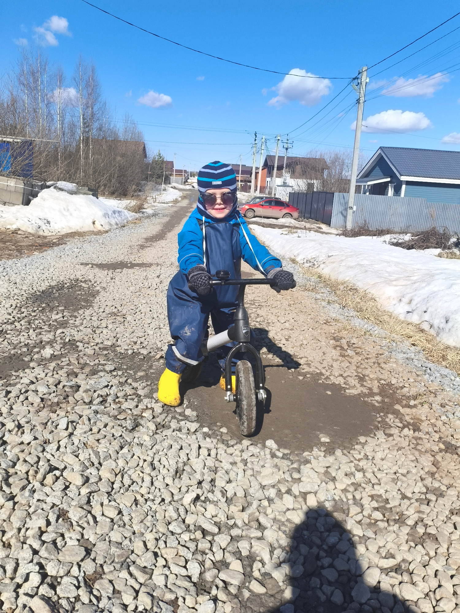 The image shows a young child riding a balance bike on a gravel road. The child is wearing a blue jumpsuit, a striped hat, sunglasses, yellow boots, and mittens. The road is lined with patches of melt…read more