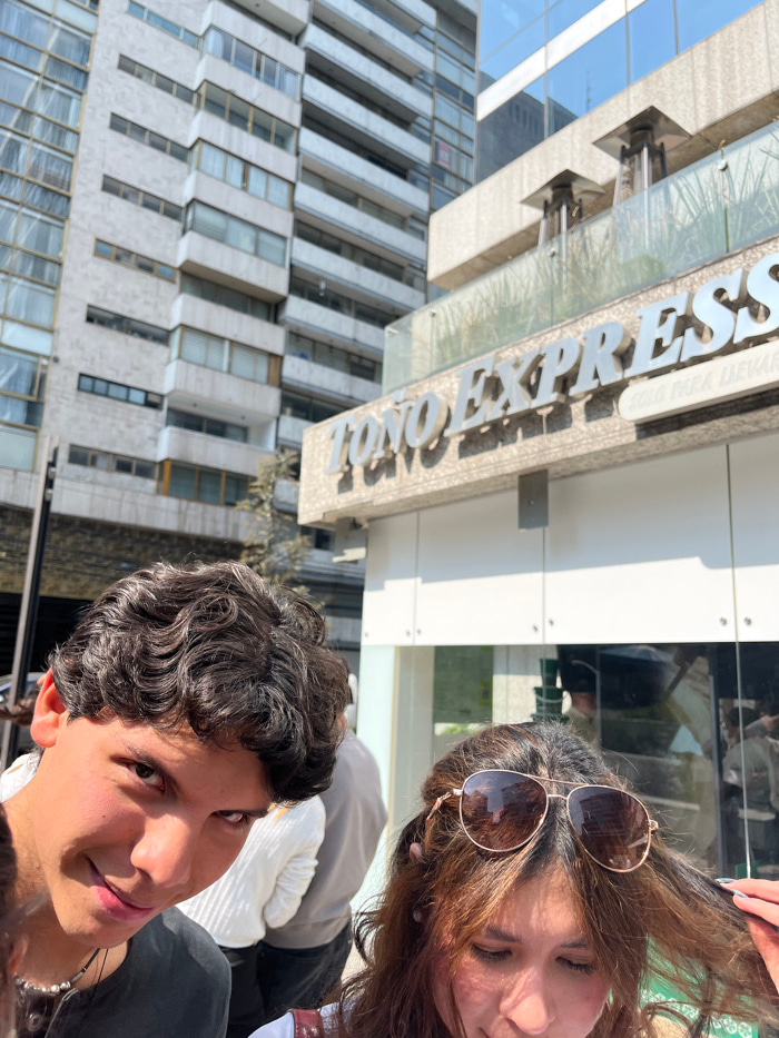A sideways snapshot shows two people, one wearing sunglasses, in front of a building labeled "TOKYO EXPRESS". The building is tall and constructed from light-colored stone or concrete with a repeating…read more