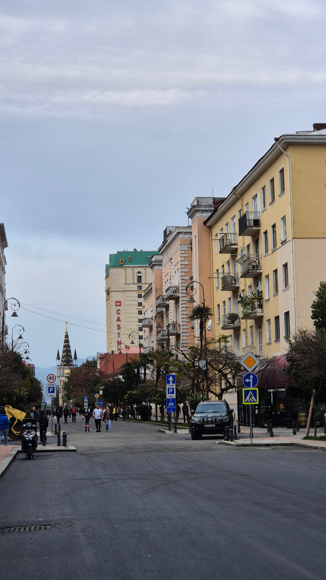 This is an eye-level outdoor shot of a street in Batumi, Georgia. The camera is oriented parallel to the street, with the view looking down its length. The sky above is overcast with thin white clouds…read more