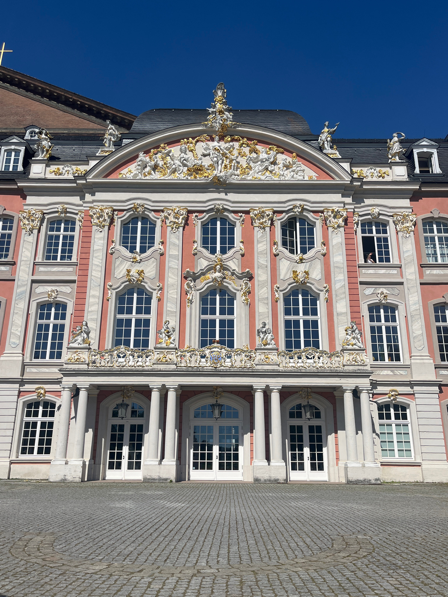 The image depicts the facade of the Electoral Palace (Kurfürstliches Palais) in Trier, Germany. The building features a Baroque architectural style with ornate decorations in gold and white. The facad…read more