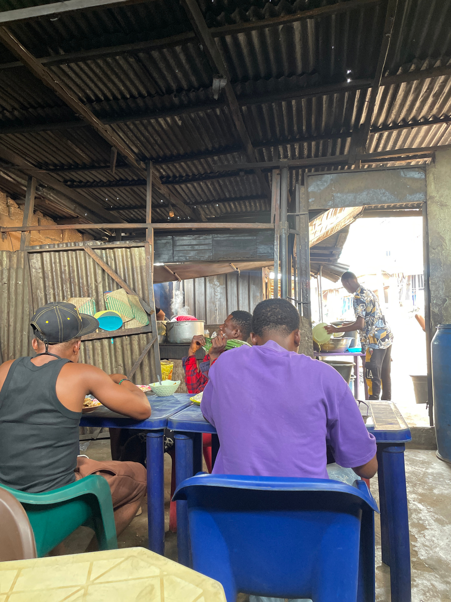 The photo shows an interior scene in Onitsha, Nigeria. Four people are visible, seated at blue and green plastic tables. The building appears to be constructed from corrugated metal sheets. A young bo…read more