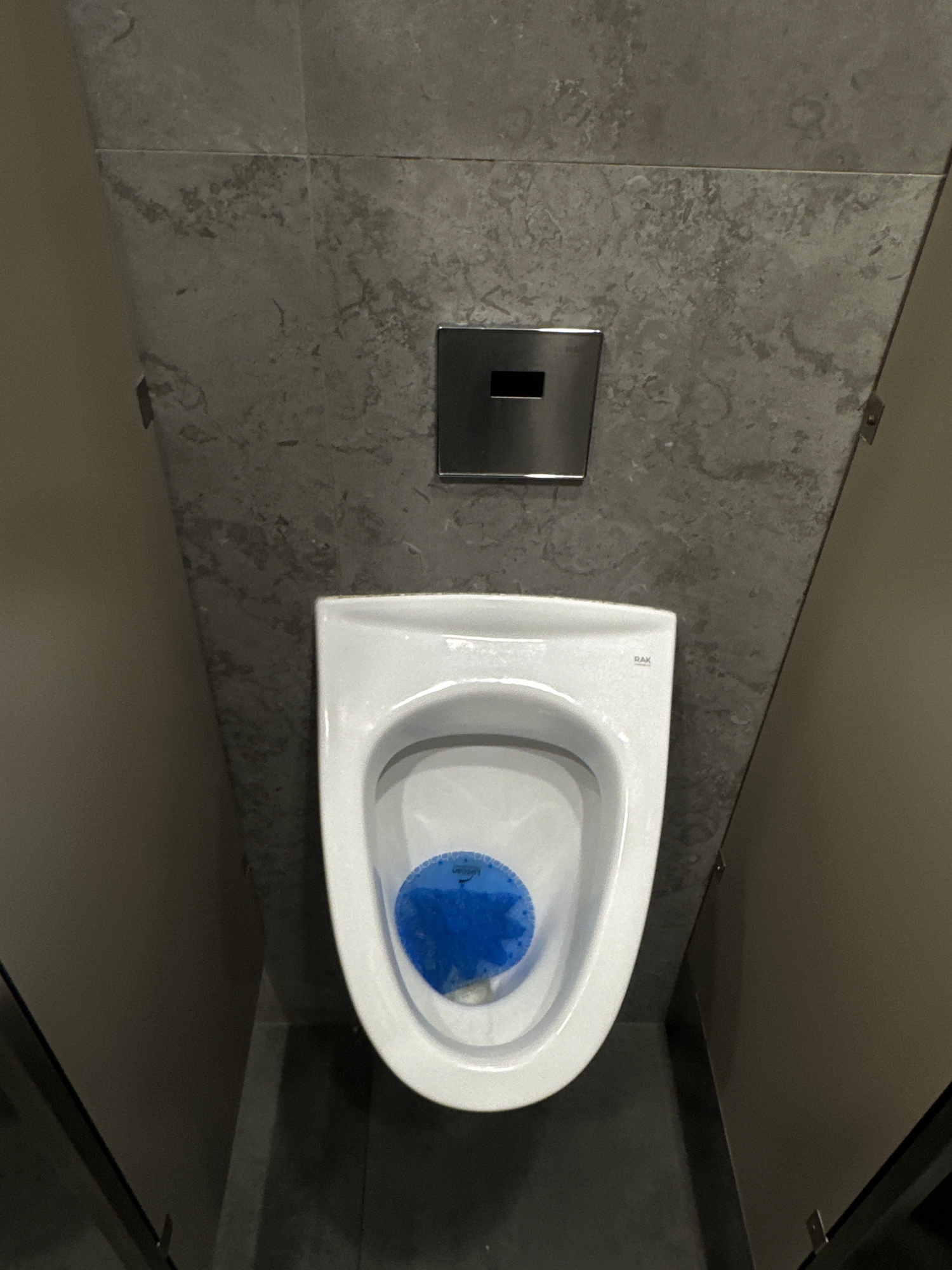 A top-down, slightly rotated, close-up shot reveals a modern toilet stall. The walls are finished with gray, textured tiles. A rectangular, stainless steel flush panel is installed on the wall to the…read more