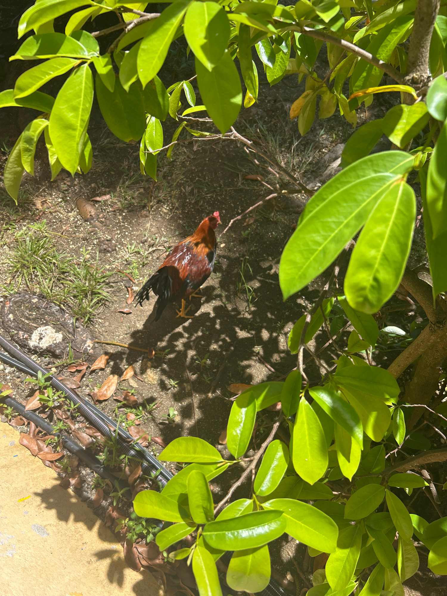 An eye-level, sunlit photograph captures a rooster standing on bare earth, surrounded by lush green foliage. The rooster displays dark plumage with hints of red and brown. The ground is sparsely cover…read more