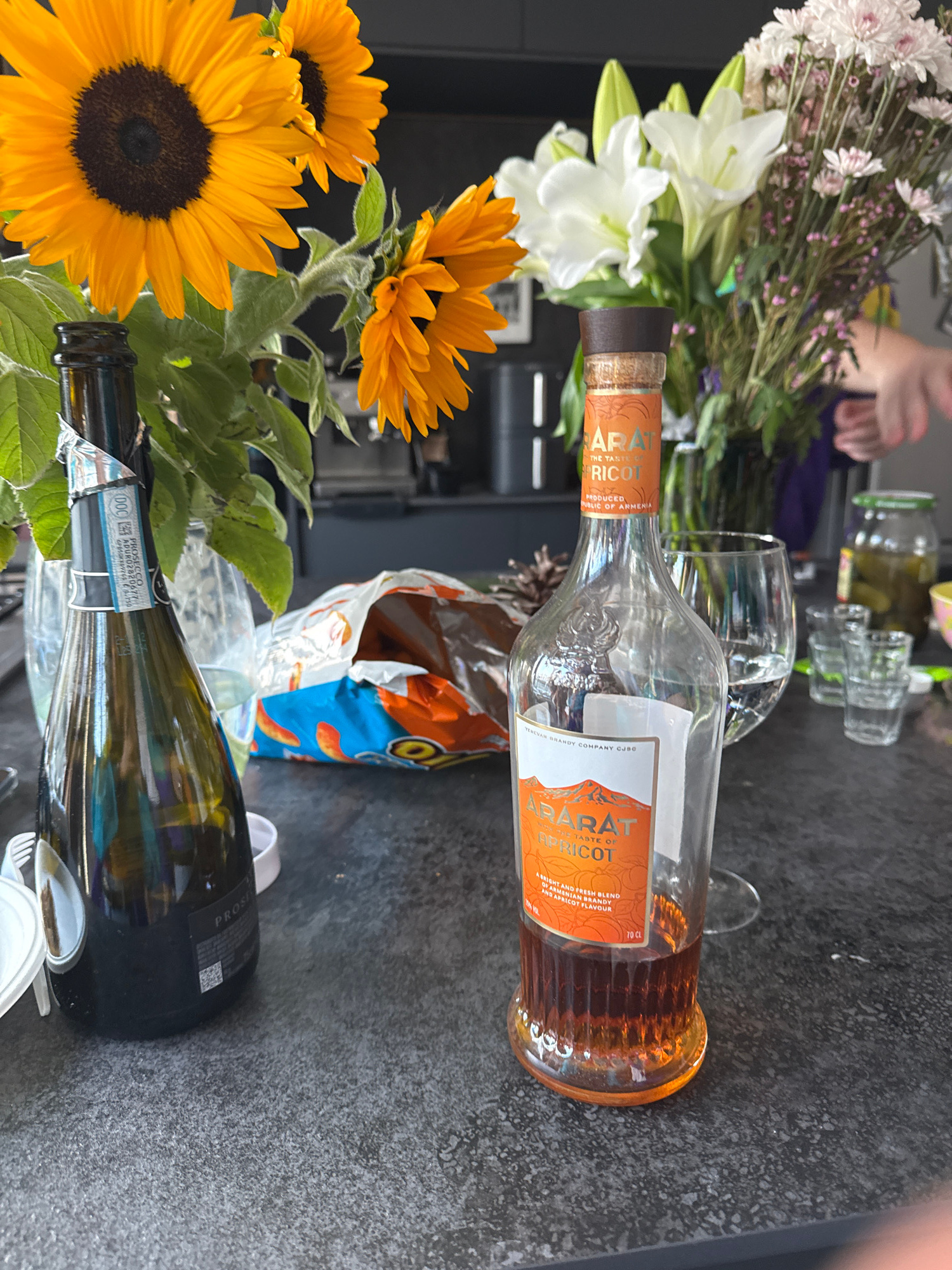 The scene is a tabletop with a variety of objects and natural elements. A bouquet of sunflowers and other flowers are prominent on the left side of the frame. A mostly empty bottle of ARARAT Apricot b…read more