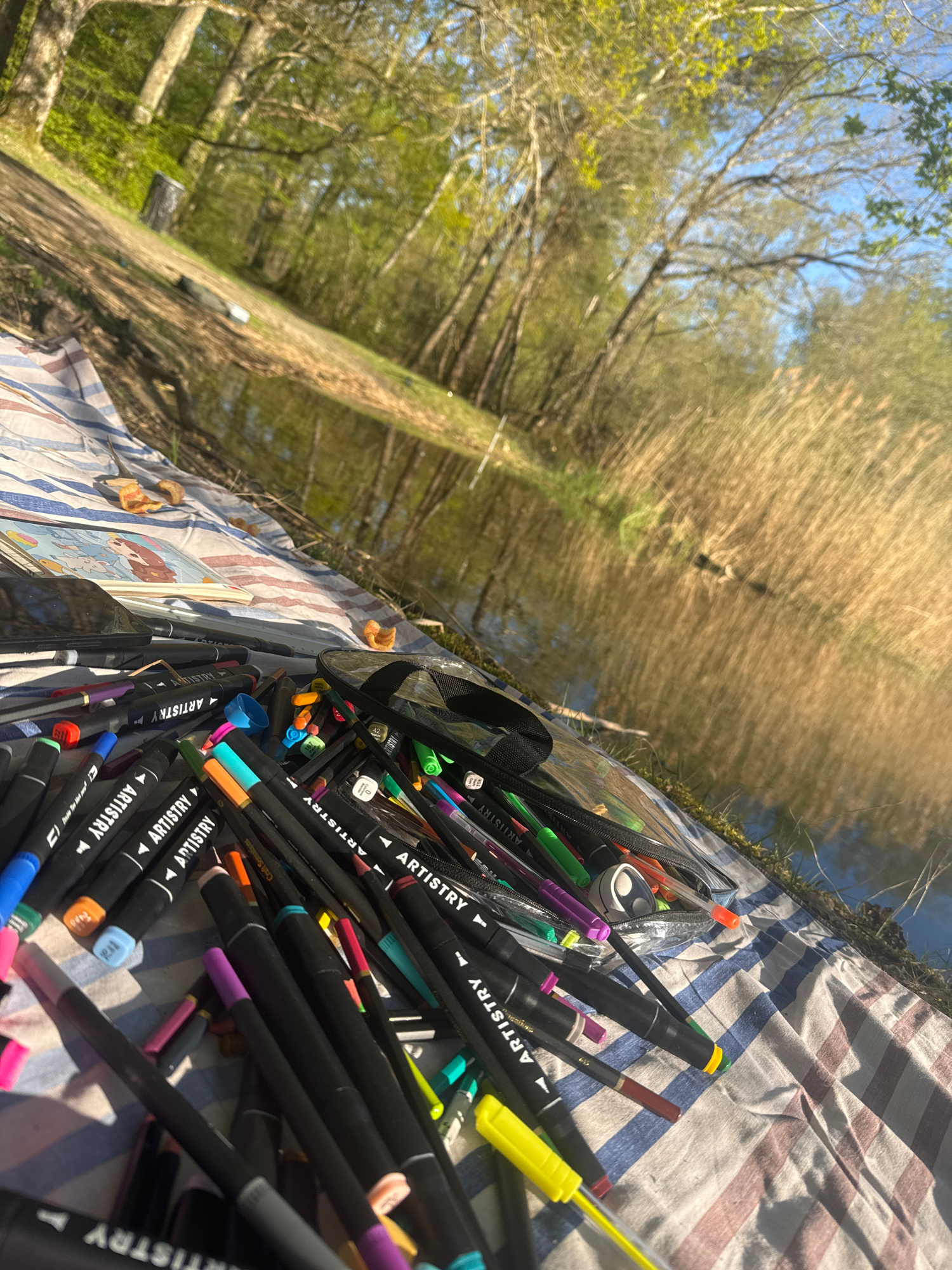 The image presents a collection of "Artistry" brand markers scattered on a striped cloth, possibly a blanket, outdoors. The markers are black with colored tips indicating their respective ink colors,…read more