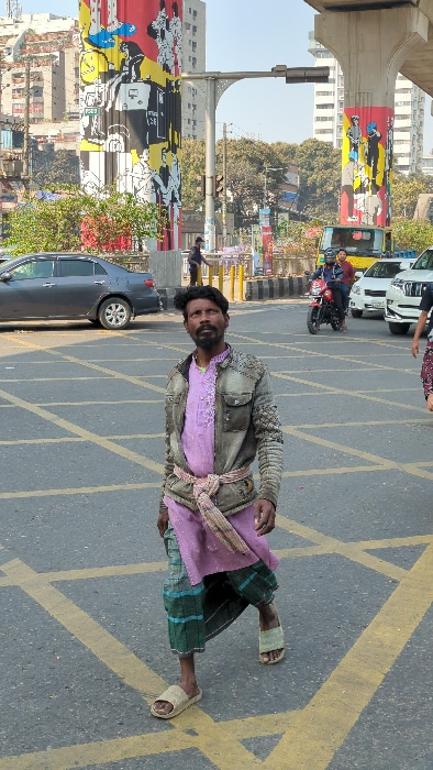 A man in worn clothes, including a tattered jacket and sandals, stands on a street marked with yellow intersecting lines. He wears a purple shirt and a lungi-style skirt. The background features a cit…read more