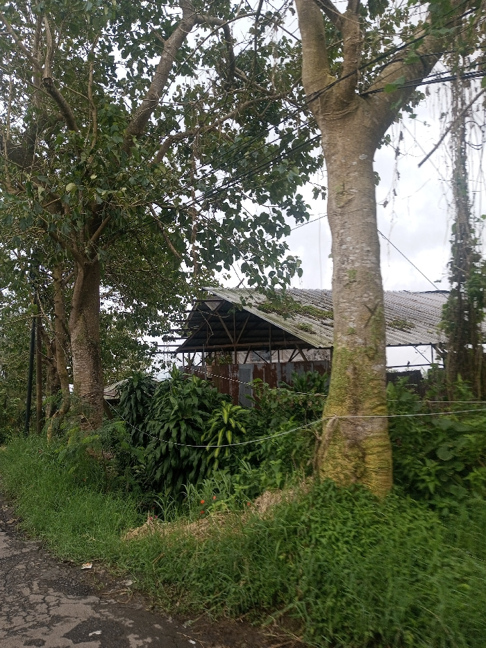 The scene depicts a roadside environment in Irupalai, Sri Lanka. A dark, cracked asphalt road occupies the lower left quadrant. Immediately adjacent to the road, a dense growth of green grass and weeds extends into the mid-ground. Multiple large trees with light-colored bark and leafy green canopies are positioned along the left side. A thick tree trunk, displaying patches of green moss and lichen, stands prominently in the mid-right, with a taut, light-colored wire secured around it. In the background, partially obscured by dense dark green tropical foliage, is a structure featuring a weathered, grey corrugated metal roof exhibiting moss growth. Supporting trusses are visible beneath the roof, and the structure's walls appear to be constructed from rusted corrugated metal panels. Dark utility lines are observed spanning horizontally across the upper mid-ground. No human figures, animals, or active interactions are present. | Open Wire