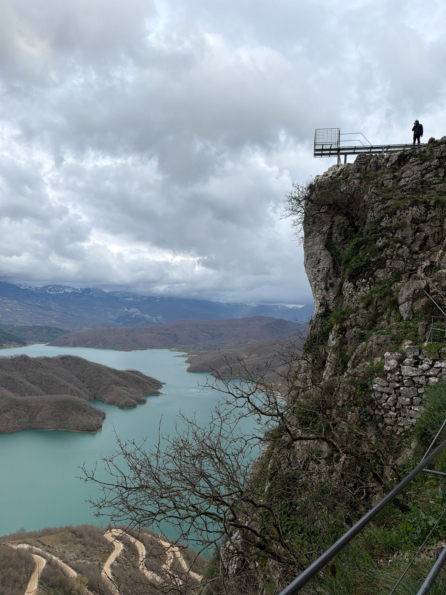 A vertical, eye-level shot displays a rocky precipice overlooking a lake and mountain range under an overcast sky. A metal railing-enclosed viewing platform protrudes from the cliff's edge, occupied b…read more