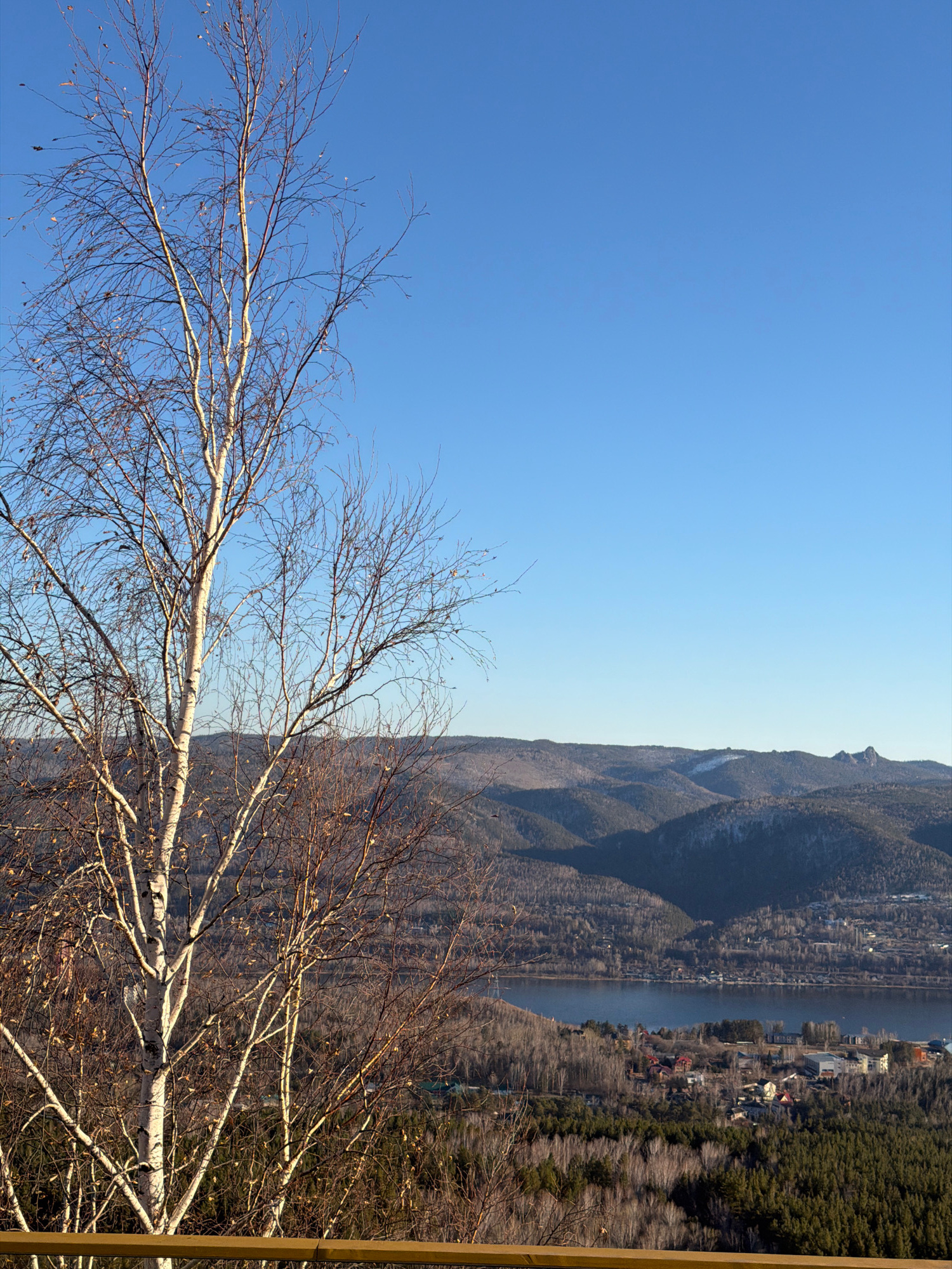 The image depicts a landscape in Krasnoyarsk, Russia, featuring a view of the Yenisey River and the surrounding mountains. In the foreground, there is a birch tree with bare branches against a clear b…read more