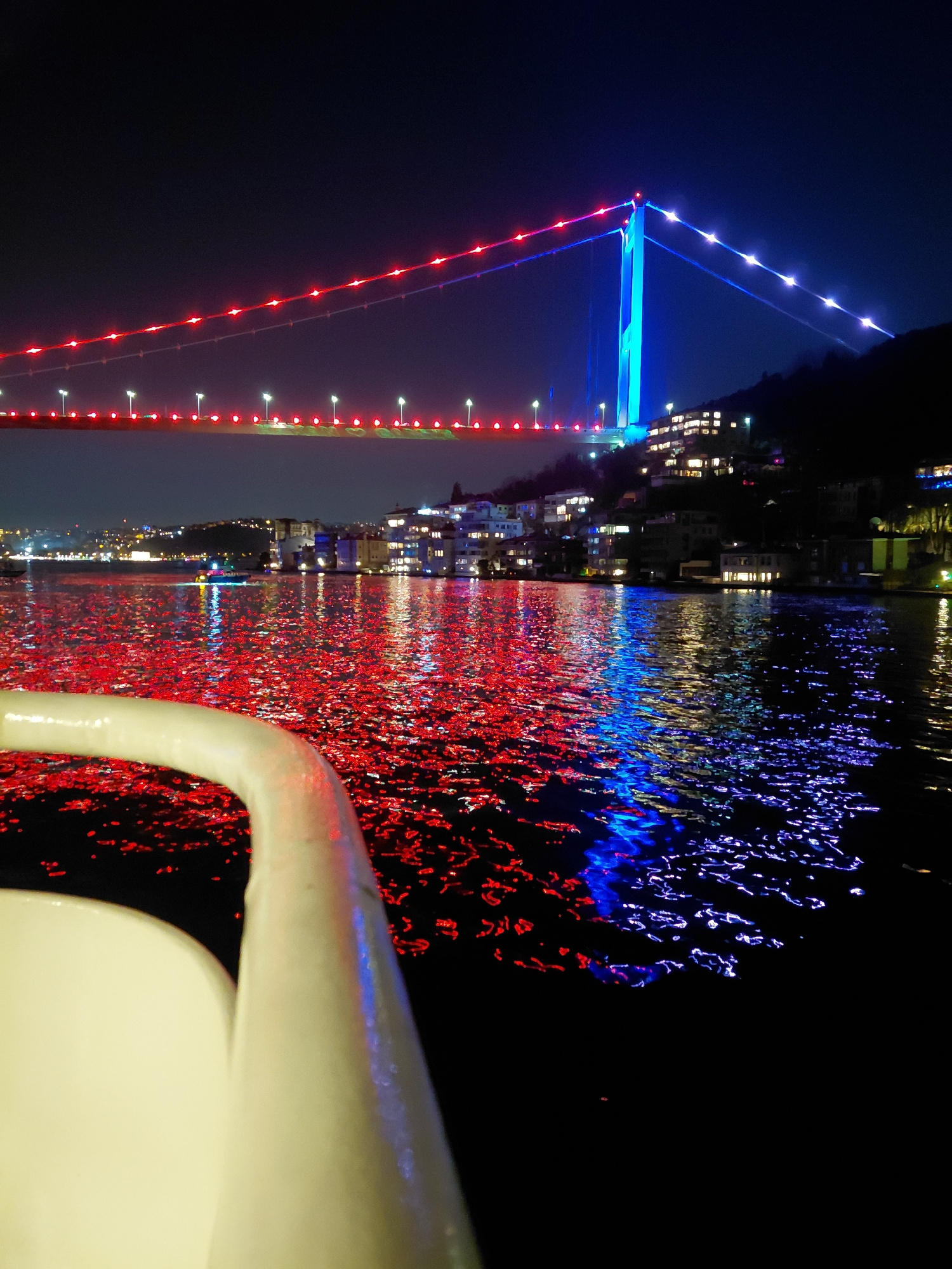 The image shows a night view of the Fatih Sultan Mehmet Bridge in Sarıyer, Turkey, from the deck of a boat. The bridge is illuminated with red and blue lights, which are reflected on the water's surfa…read more